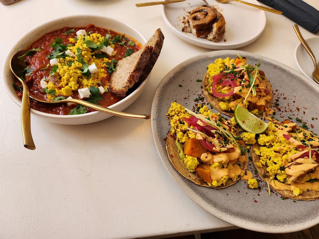 Alles war super. Wir hatten Shakshuka, Omelette und Tacos. Und eine Zimtschnecke. Alles mega lecker.