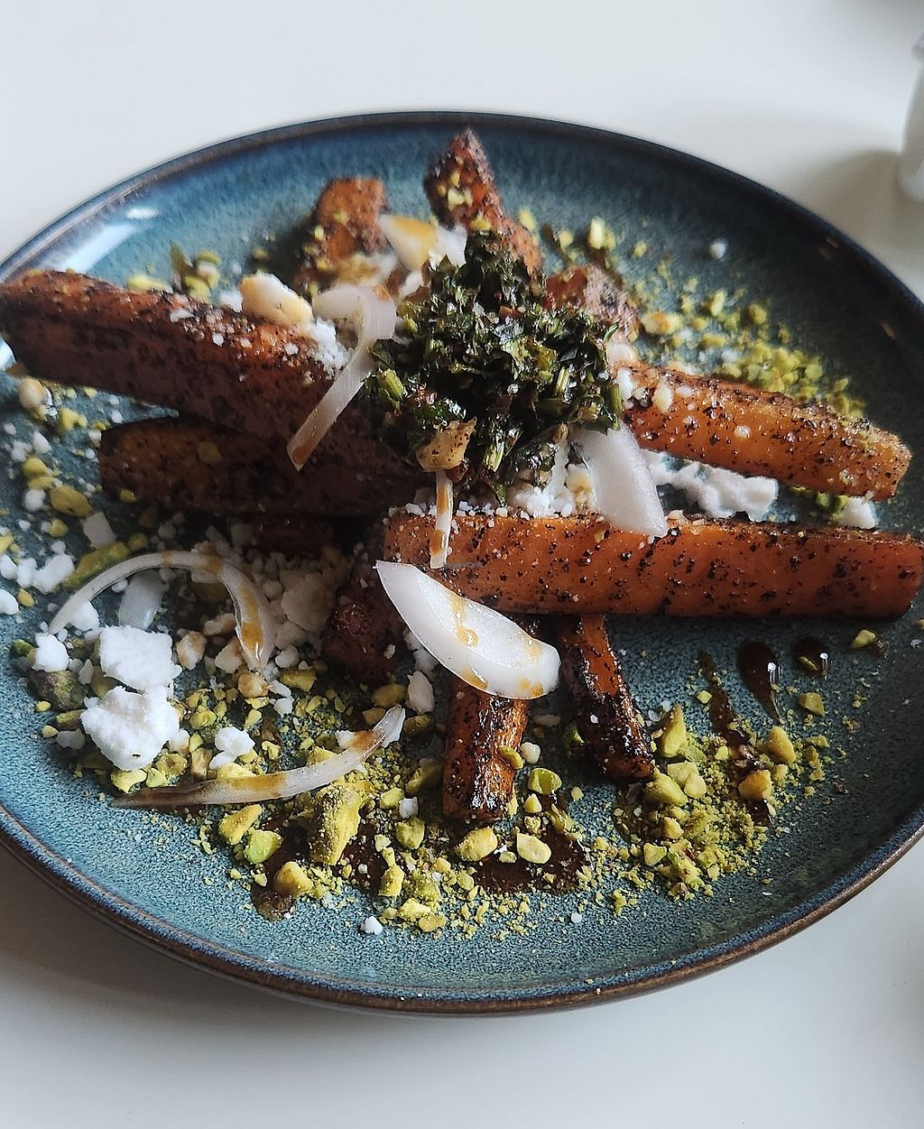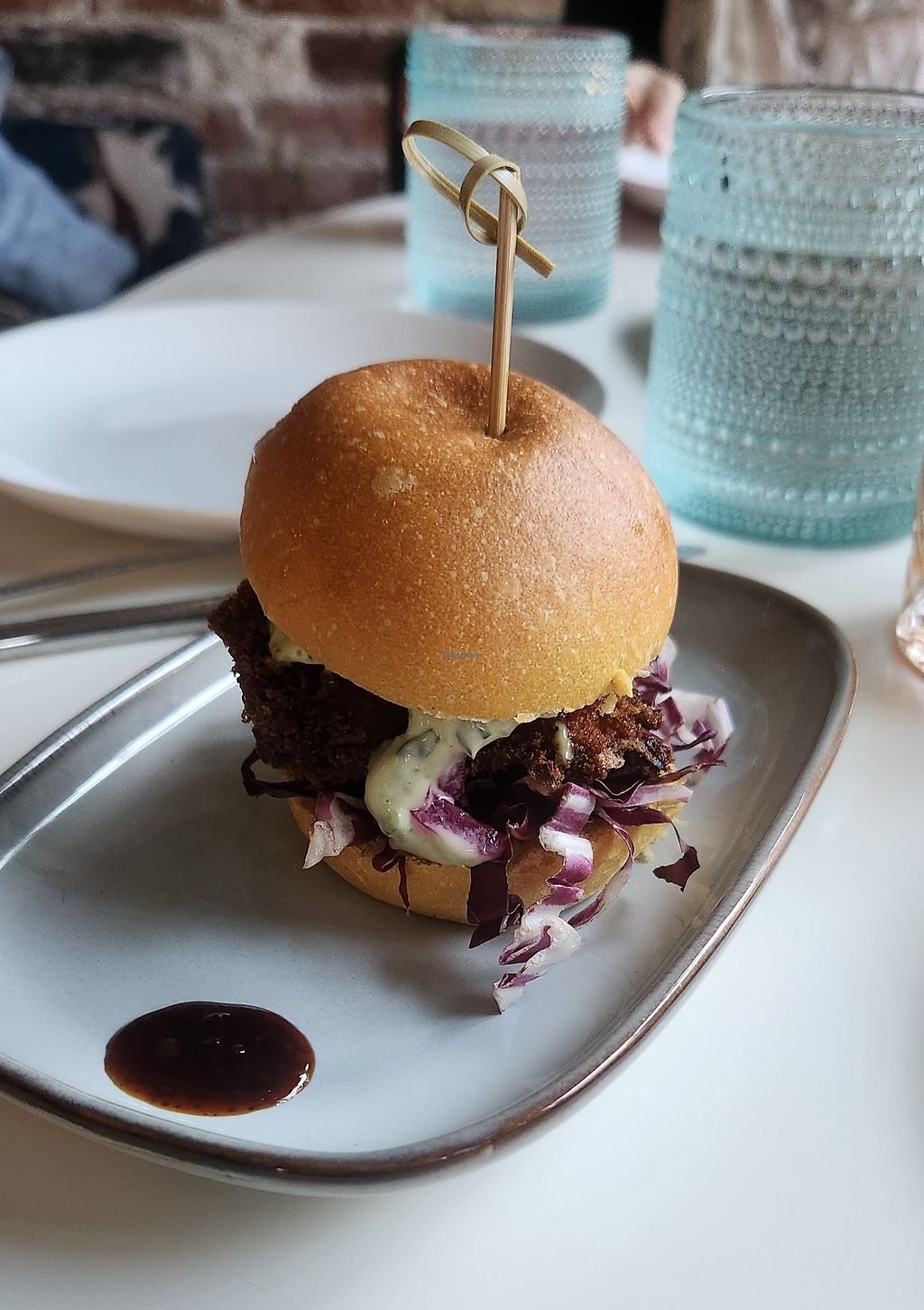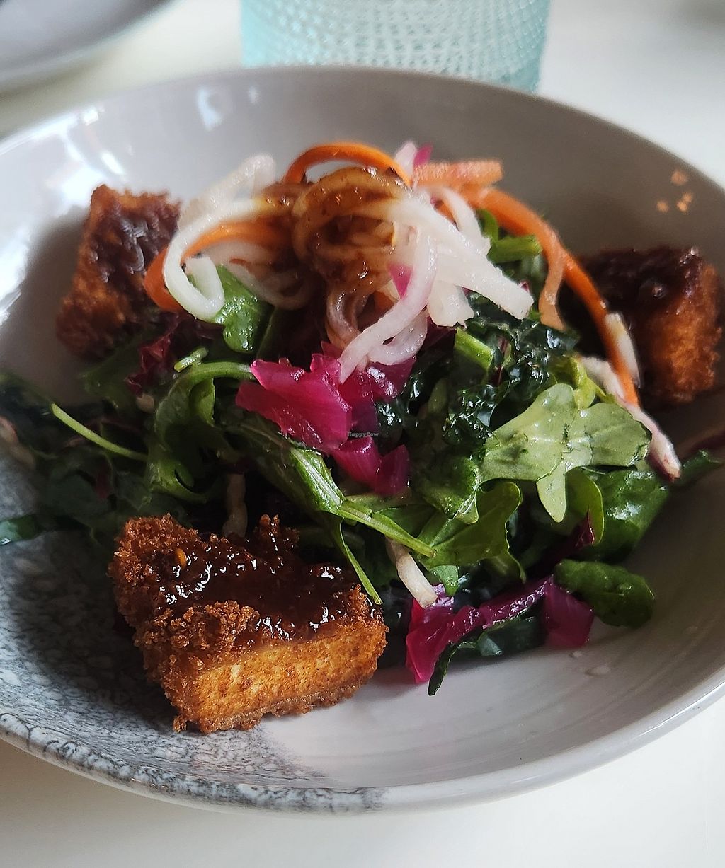 This place ranks up there with the best vegan restaurants we have ever been to so far. Everything was fresh made, so no “fake” meats. Their twist on some of the usual vegan dishes you might find elsewhere is what sets them apart. Everything was perfectly seasoned and delicious. I started out with the lavender lemonade, which I highly recommend. We had crispy broccoli with pomegranate seed, curry and carrots, along with marinated olives for appetizers, or “tapas”. For our big plates, we had the eggplant and the gnocchi and cheese, which is a spin off of macaroni and cheese. The best I’ve ever tasted. For dessert we had brioche bread pudding, and sour cherry fruit crisp. They serve French press coffee at the table. We had a corner table by the window, and it made for a perfect setting to enjoy our meal. The server was phenomenal. I can’t say enough good things about this place.