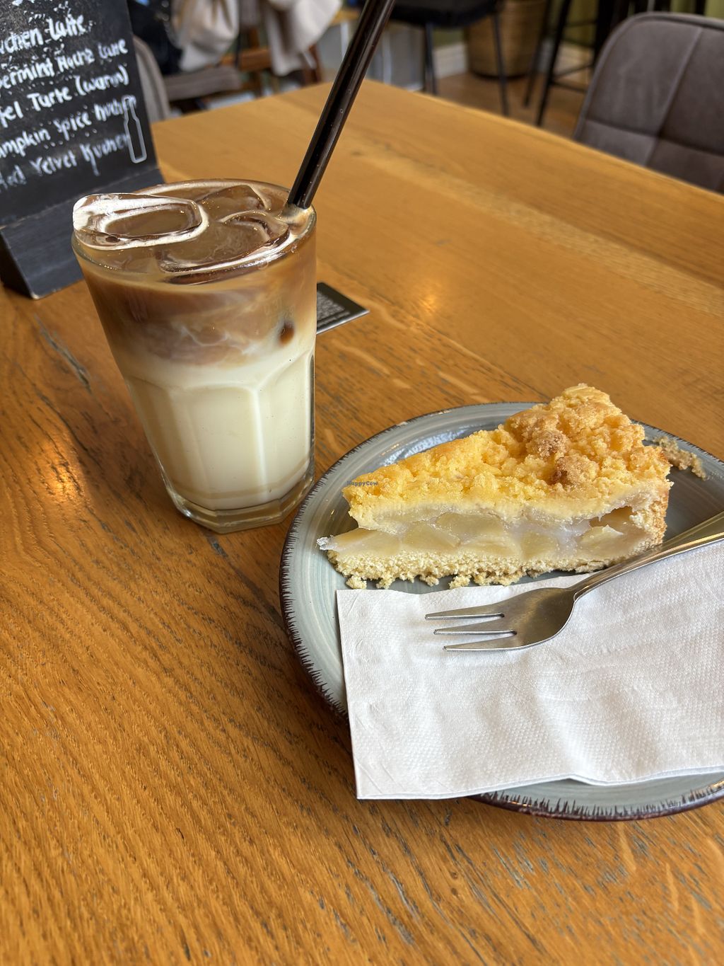 Cons: Unverschämter Aufpreis für Hafer-, Sojamilch etc., Sehr kleine vegane kuchen dazu überteuert, Kaffee sehr sauer und wenig aromatisch.(Geschmack)