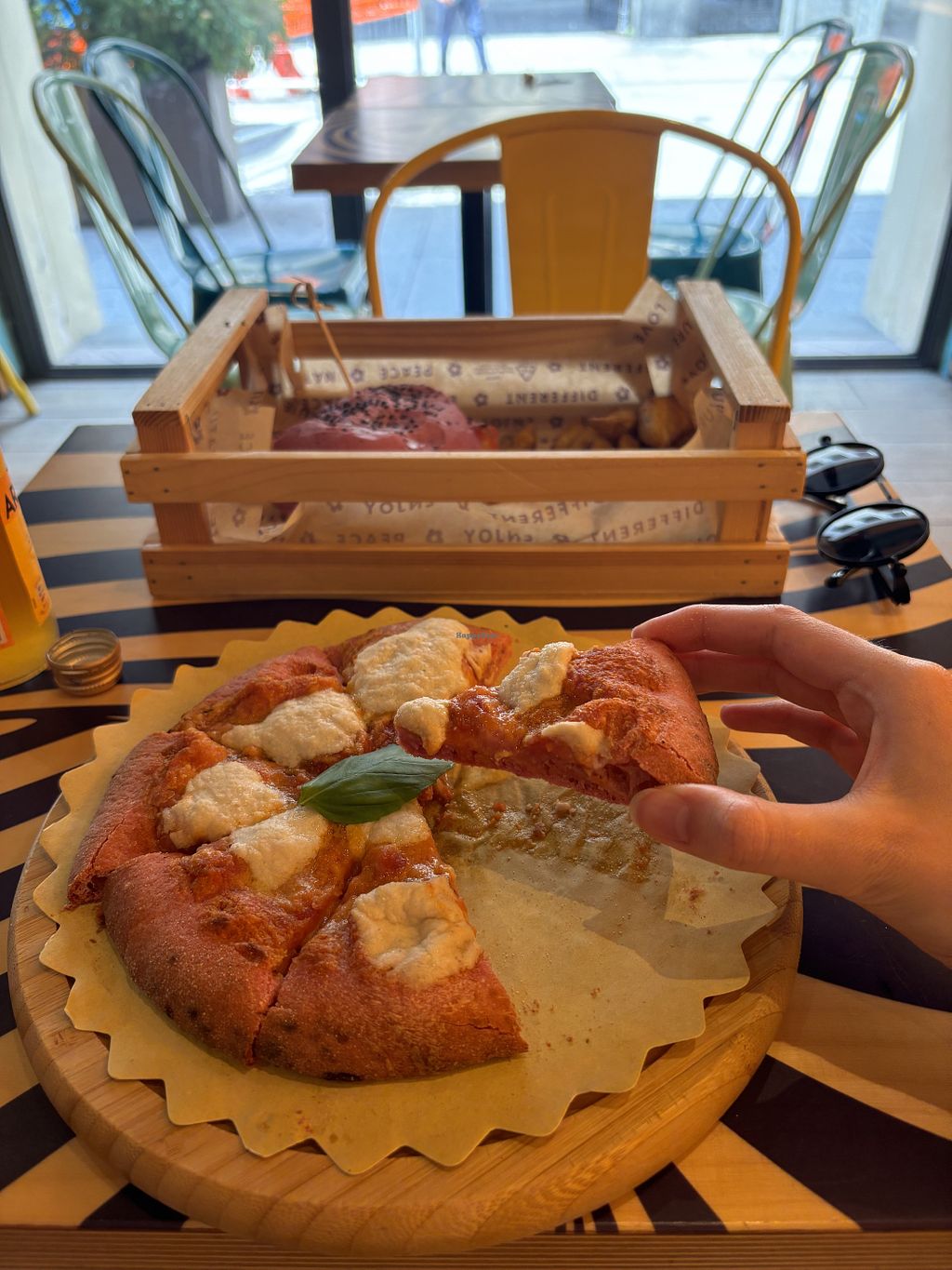 Both the burger and the pizza were delicious. The cheese on the pizza wasn’t the typical hard kind like Violife. Instead, it had a more delicate flavor, closer to cottage cheese or something similar — a huge plus for me.