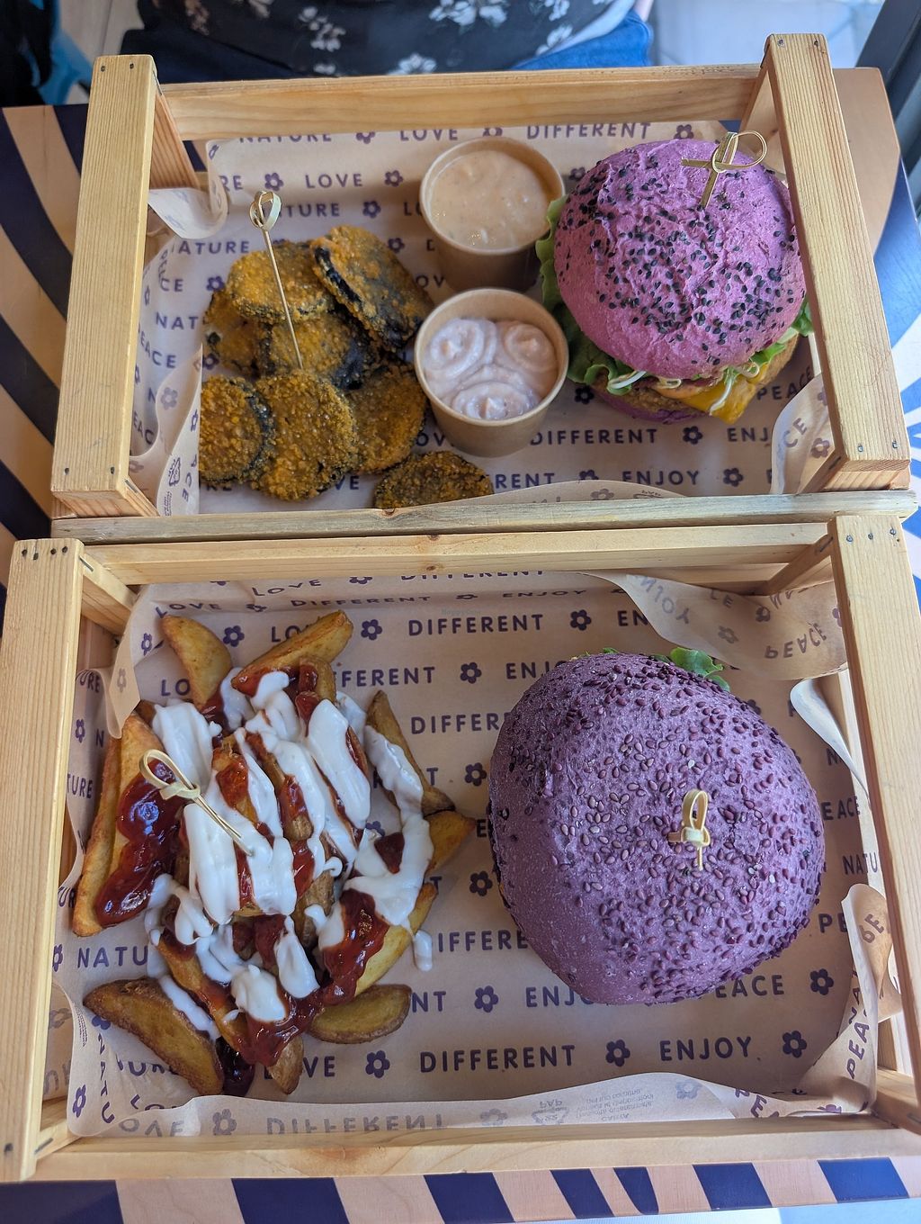 Really tasty burgers - more exciting than a typical vegan burger! Loved the different colours. Lots of different sides. The breaded aubergine was especially good!