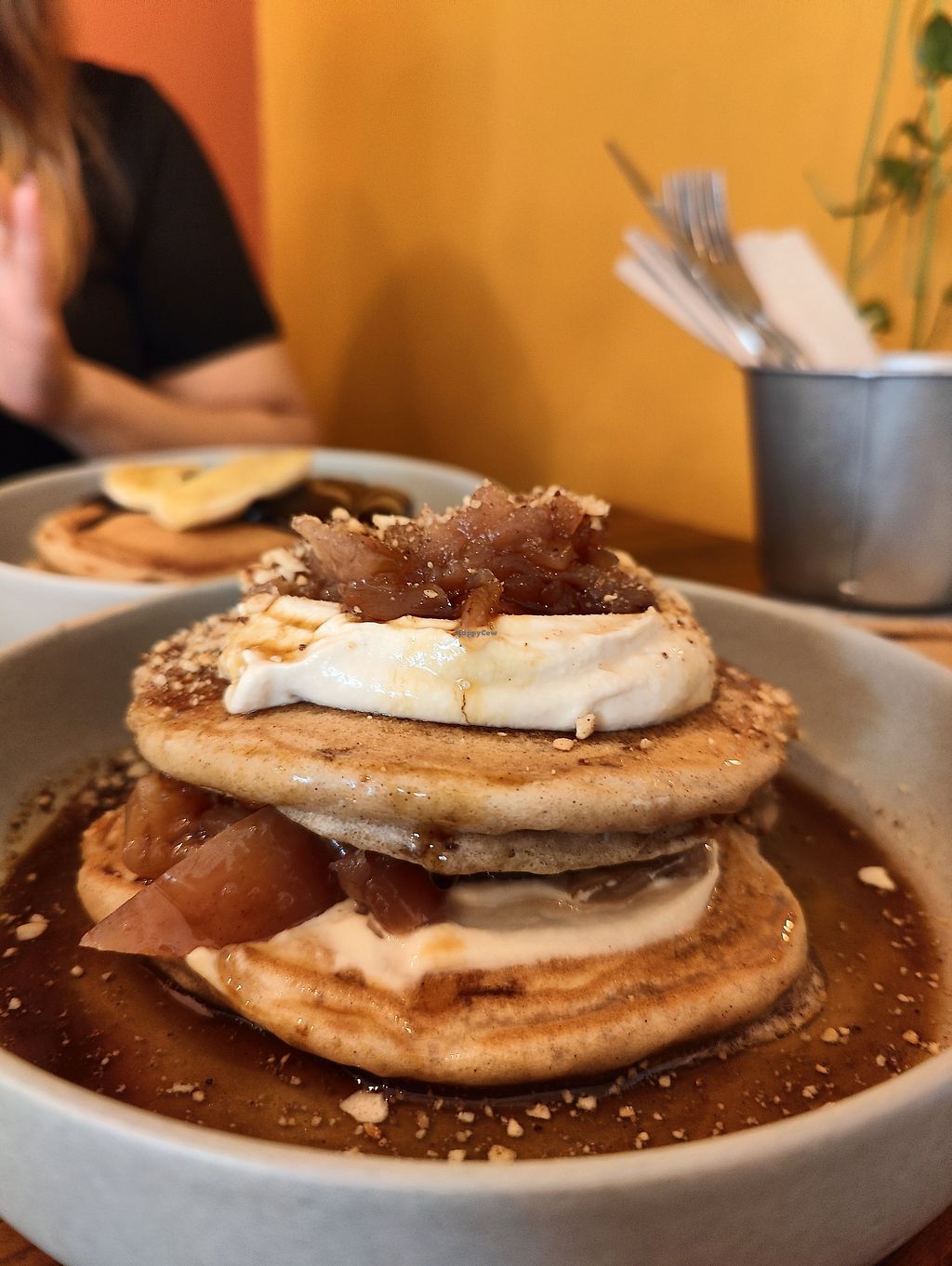 From the warm welcome to the decadent food, everything was perfection. I ordered the apple pancakes which were very yummy. I was originally apprehensive that only 2 pancakes would fill me, but it proved to be a hefty portion since they also fill a layer between pancakes with more apples and top with cashew cream cheese which was on the savory side to balance out the sweetness of the apples. I'll be back soon to try the sandwiches which looked scrumptious.