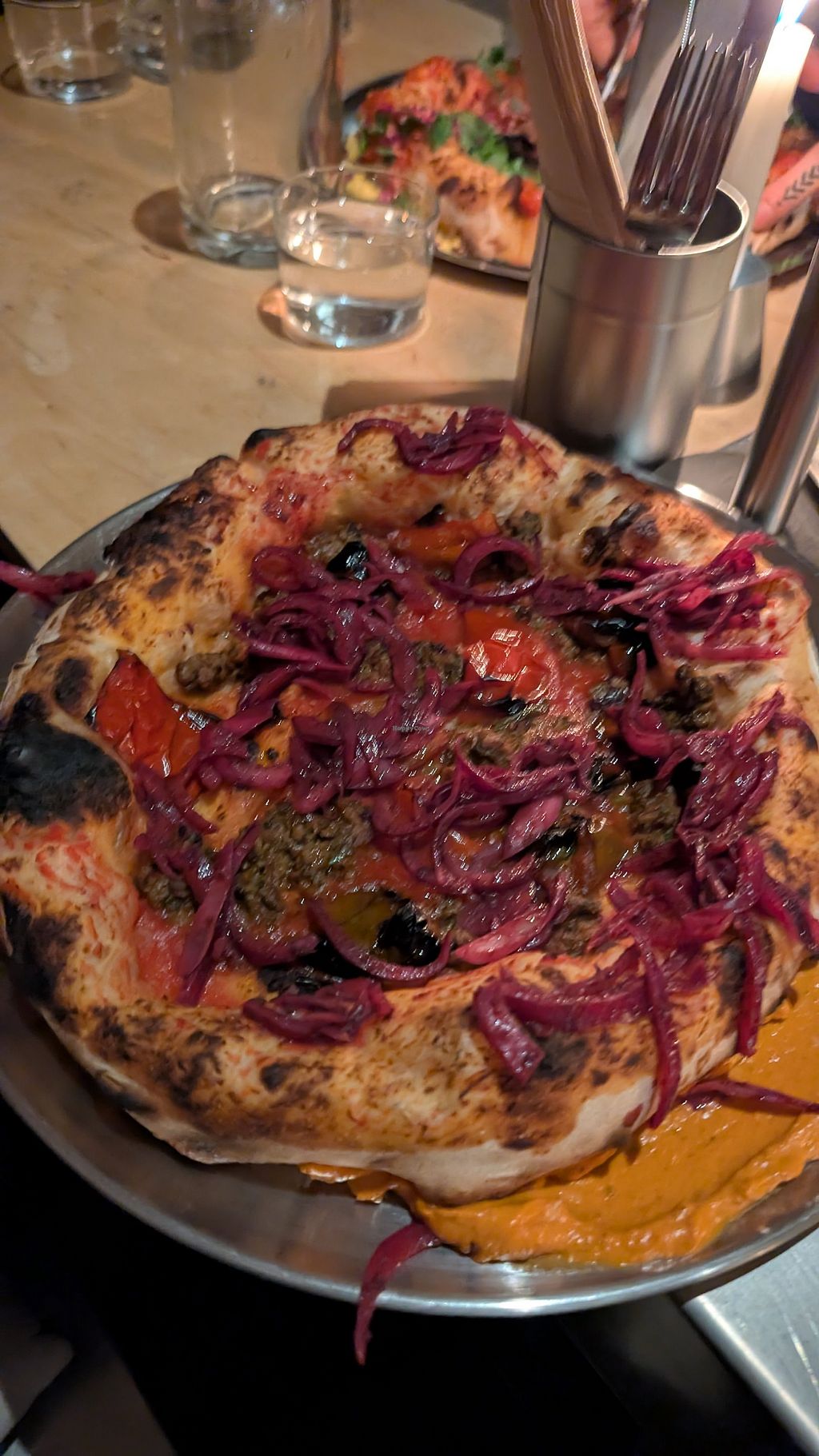 Our group ordered five pizzas, my favorites were the one with pumpkin cream and the one with potatoes, also loved the chocolate dessert with the miso caramel sauce - delicious. Creative, interesting food. We didn't love the pizza in my photo with the pickled onion, it just fell apart, was very soggy and difficult to eat. For any sound sensitive folks - the acoustics are rough in there, it's super loud, suggested to eat outside.