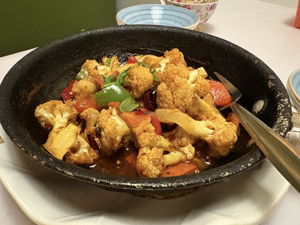 I had high expectations after reading the reviews but it fell a bit flat for us. The chilli dumplings had zero chilli and weren't served hot. The mushroom tofu clay pot was more sauce than anything else but did have a good Szechuan pepper flavour. The kung pao hedgehog mushroom also had no chilli heat and was very saucy. It was good but it didn't live up to the standards we were used to in Hong Kong.