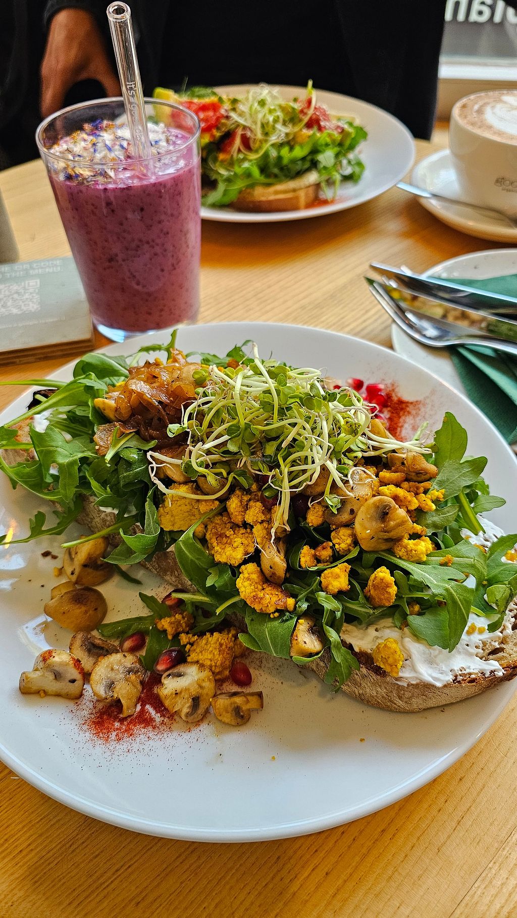 Sandwich mit Champignons und Rührtofu, Berry Smoothie