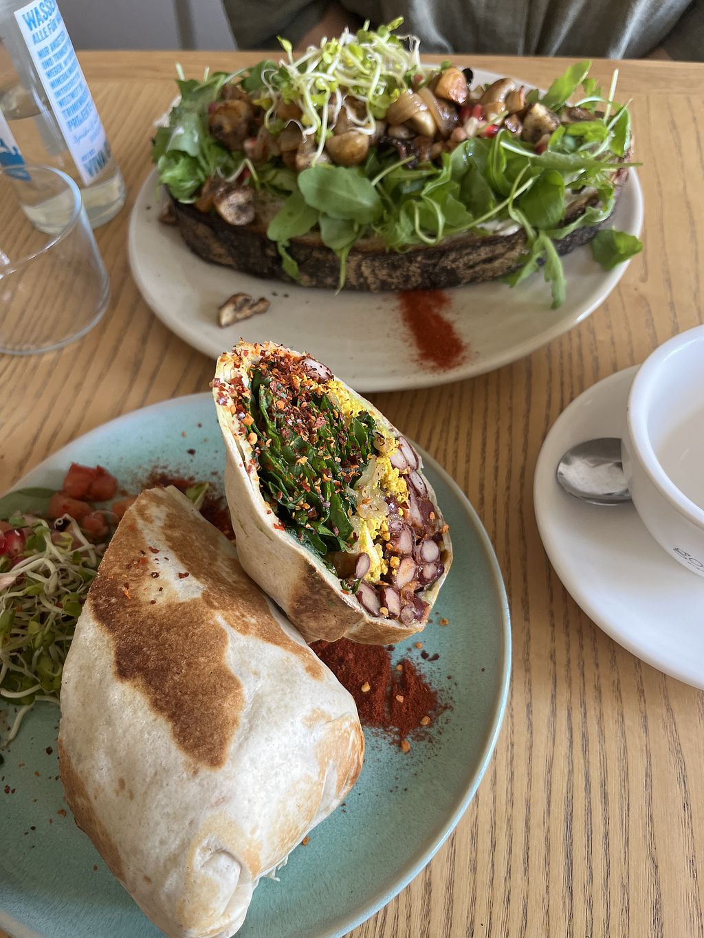 The bread with caramelised pear was very tasty. Although the spreading of the cream cheese and feta could have been a little better. The breakfast wrap was also very tasty. Although warm scrambled eggs would probably has been a better choice. There was a lot of red powder on both of our plates. Unfortunately, we couldn't identify what it was and it was quite distracting.