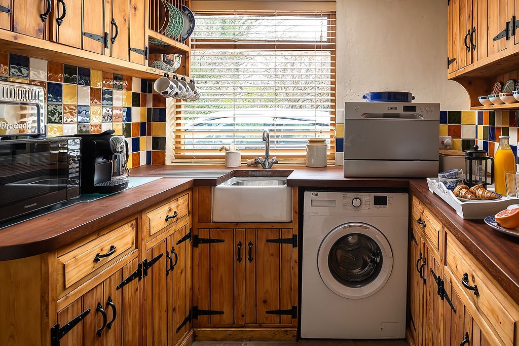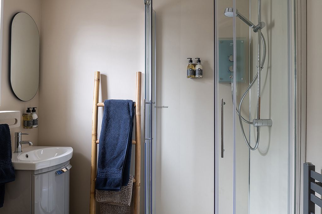 Very well equipped kitchen, amazing what you can fit into the space. Toaster, coffee maker, kettle, microwave, worktop hob, dishwasher, washing machine, fridge/freezer and supplies of various teas, coffee pods, oat milk minis, vegan cleaning products. Also, a vegan welcome pack which appears to vary, but ours was posh chocolate, salted popcorn, kimchi, local coffee and kitty treats.
