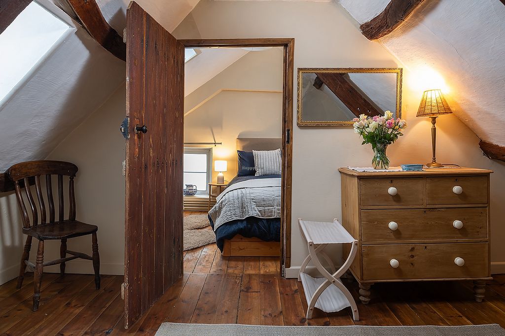 Handheld and overhead shower in the downstairs bathroom, with Myddfai products in place. Very comfy king-size bed in the attic space with a separate and ample dressing area.