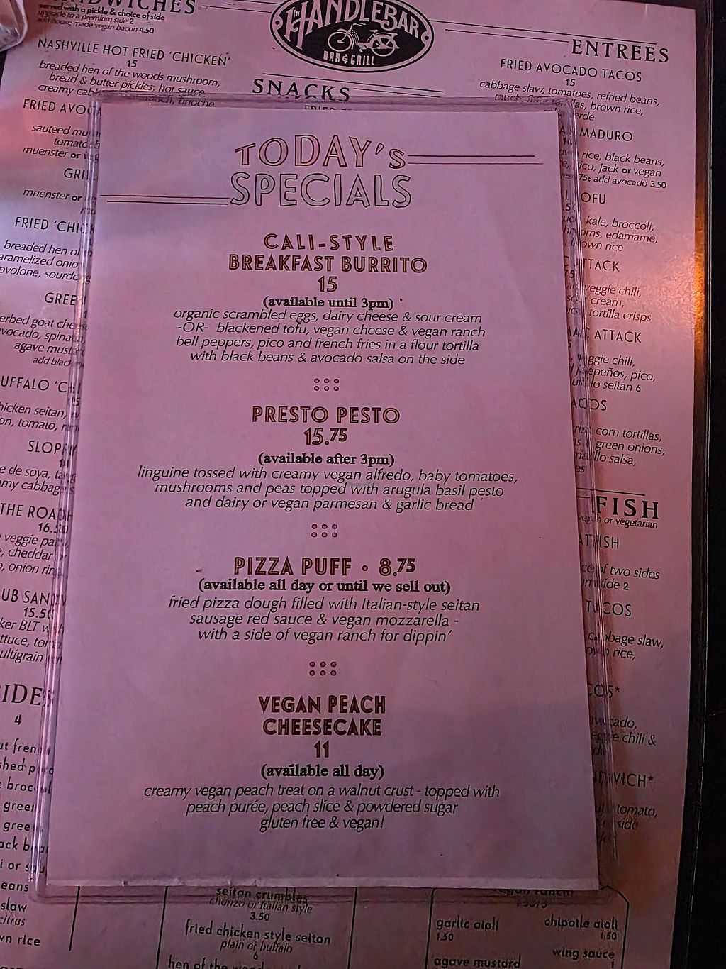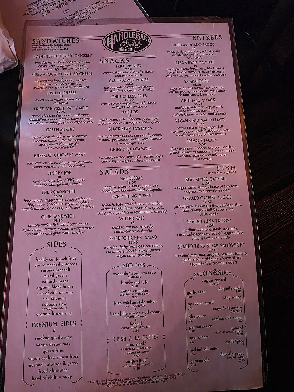 Best vibe ever inside and on porch! Clearly labeled vegan options, and CONSISTENTLY fantastic foods. I bring Omni people with me to Handlebar all the time, and they are always impressed. Do not miss out!