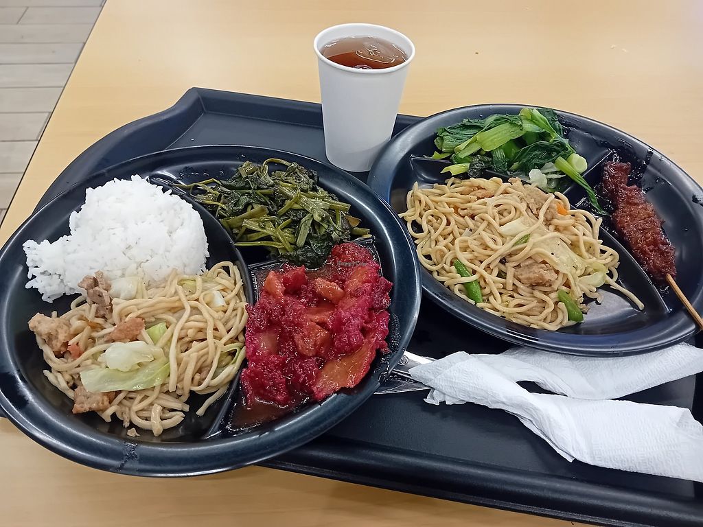 All vegan place in the food court, no frills food, noodles and or rice plus two viands (= fake meats and / or vegetables), ice tea. Cheap. You order at the counter, pay right away, get your tray and look for a table anywhere in the food court