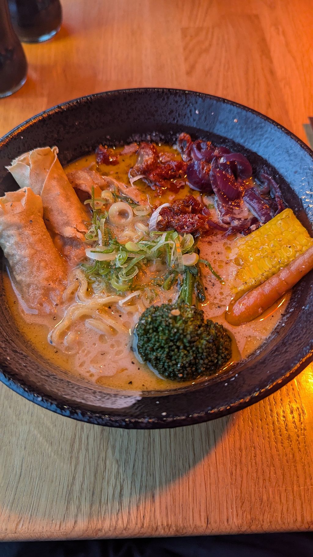 I had the vegan ramen made spicy. It was not very spicy. A very enjoyable meal, hearty, and flavorful, with lots of elements. Not what I expected for a tourist town like this. I would gladly recommend it.