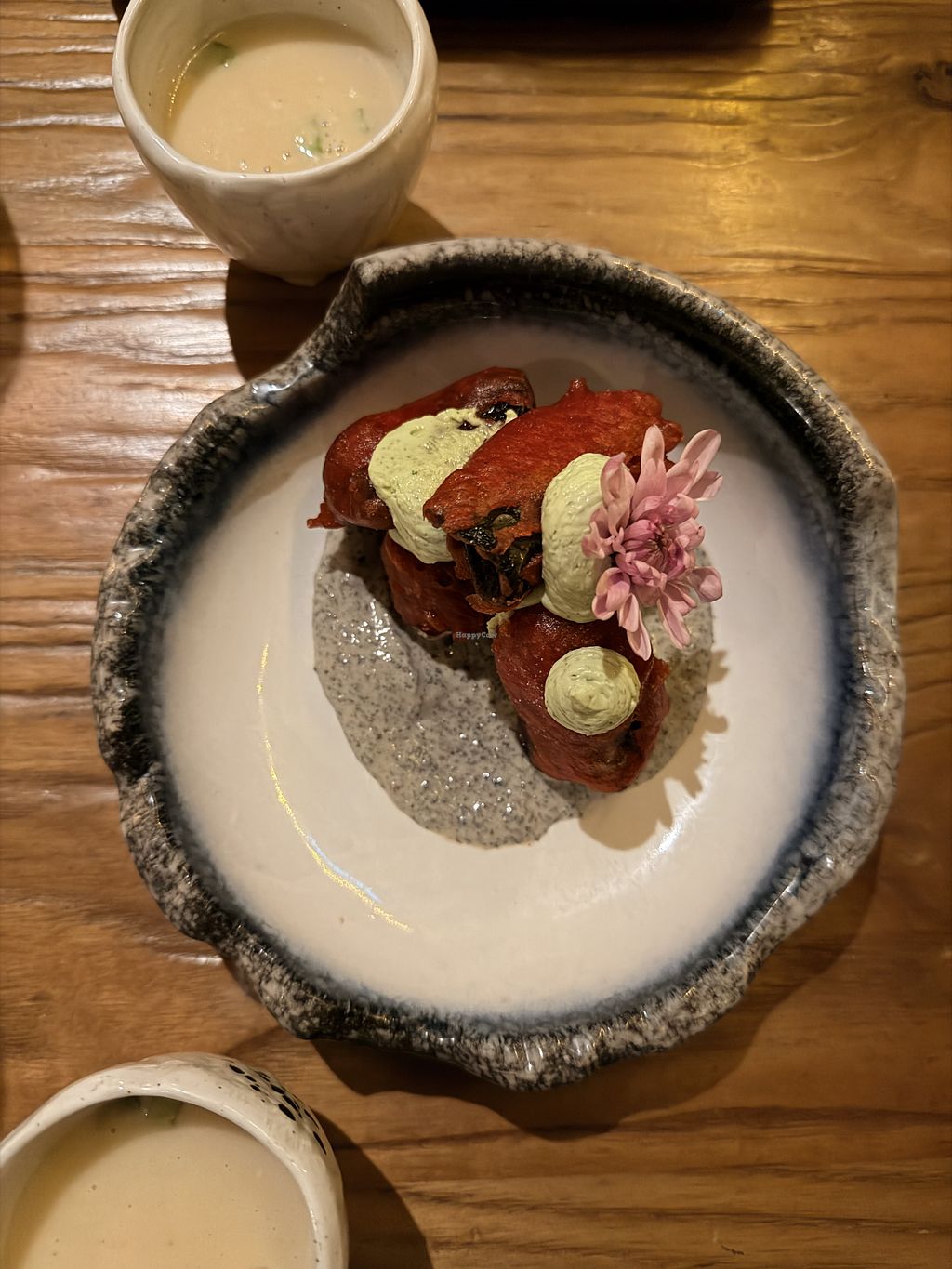 My spouse and I, who have been vegan since 1991 and 1990 respectively, had the most wonderful of experiences at Hearth. We went there for our 34 year anniversary and were so delighted with the welcoming and warm encounters we had. We felt so special by the personal interactions. The service was truly beyond compare. The food was inventive and visually marvellous. We had the tasty green curry coconut cauliflower soup and they even anticipated our sharing, separating it into two bowls. This gesture reveals how attentive they are to their patrons. We had the Mexican inspired sushi that was innovative and delicious. We then had the Black Charcoal ravioli filled with shiitake mushrooms and the King oyster mushroom scallops. Both were delectable. We highly recommend this terrific vegan restaurant and we will return again and again.