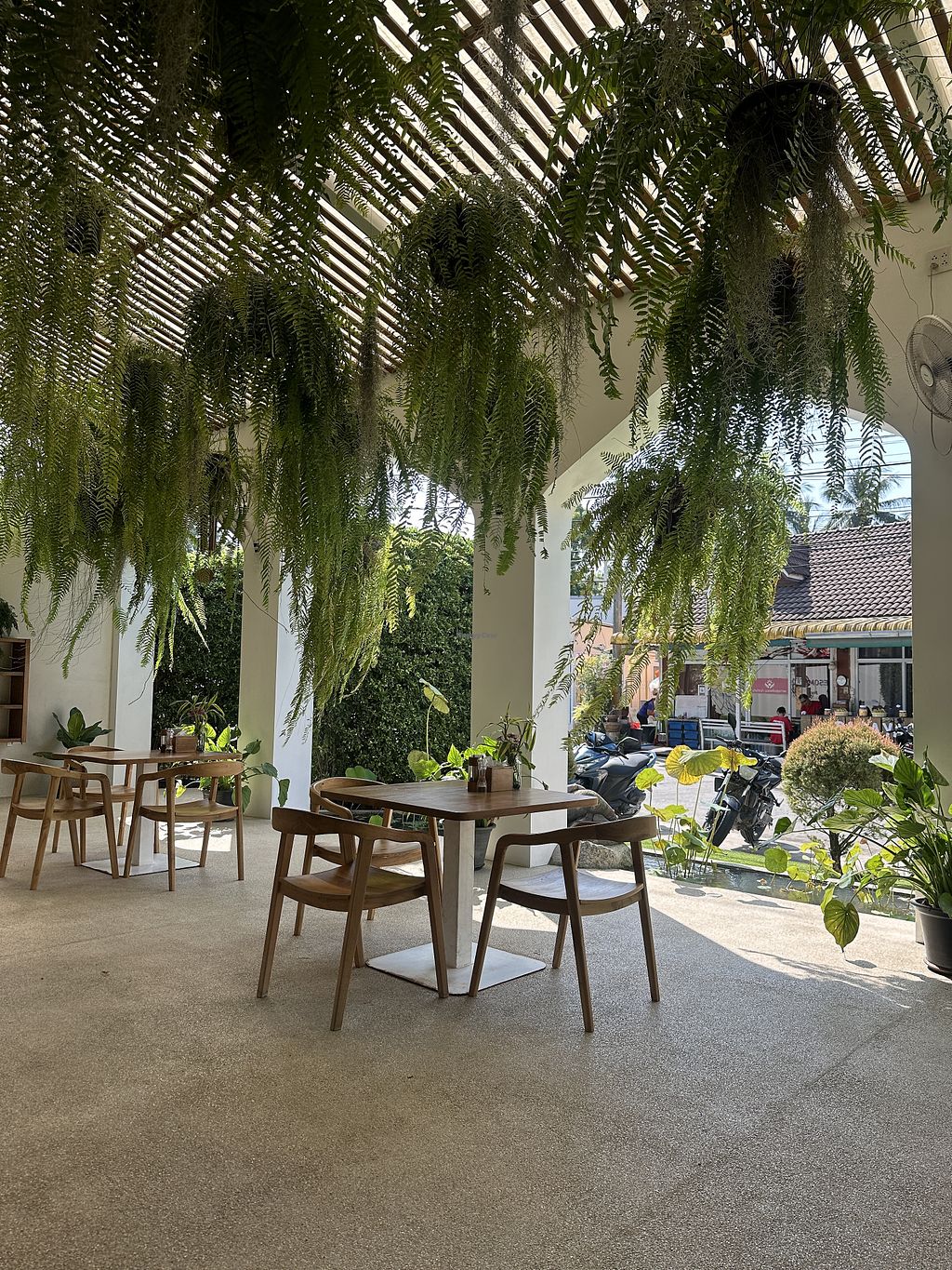 The cafe is nestled in a lush, tropical garden, creating a serene and tranquil atmosphere that instantly puts you at ease. The gentle breeze and the occasional chirping of birds add to the overall calming experience.