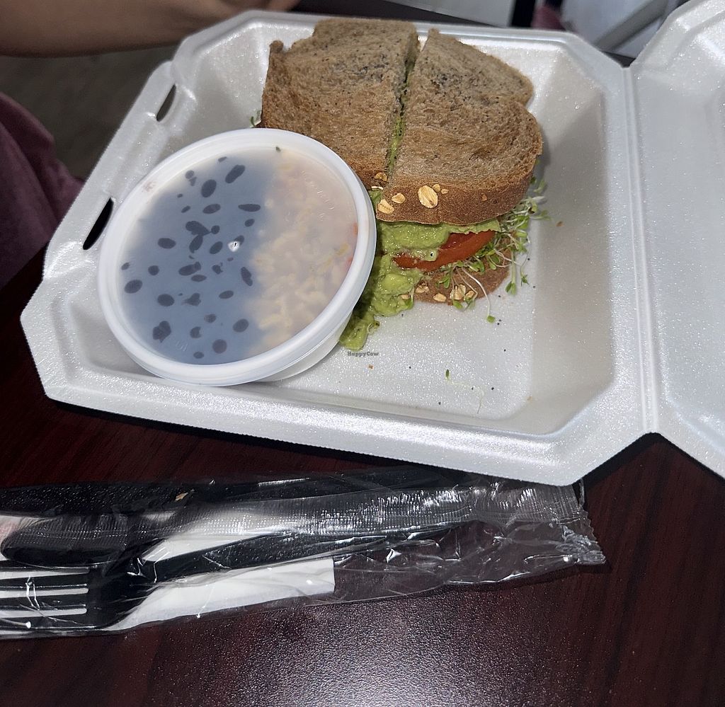 Serves meat, vegan options available. Could get the Bilbo sandwich (with guac, tomato, alfalfa, cucumber) which comes with side of either black beans, carrots, or potato chips. Open Mon-Thu 11:00am-9:00pm, Fri-Sun 11:00am-10:00pm.
