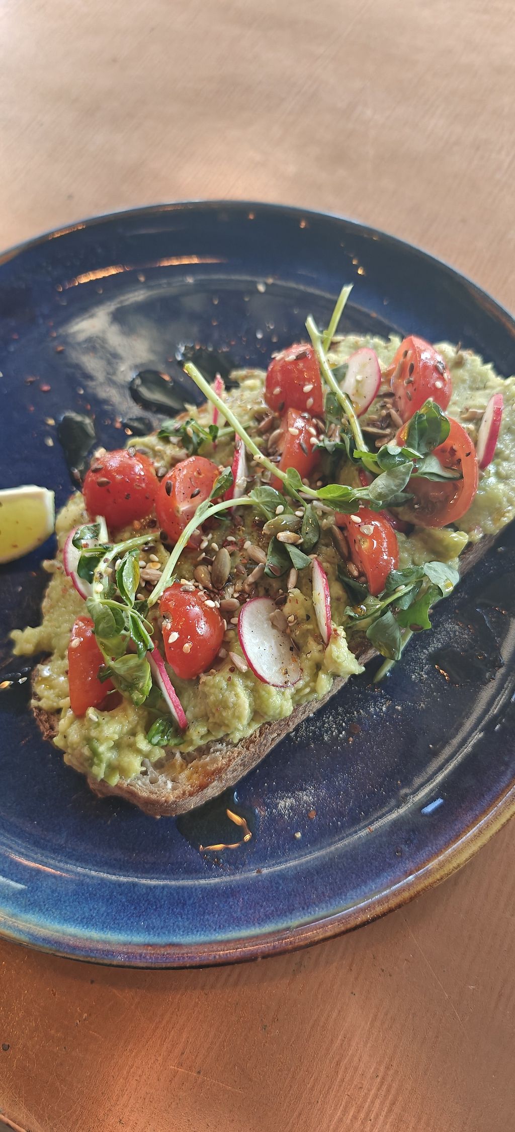 I had the avocado toast, which was maybe a bit pricey, but tasted very good! It is not vegan by default, the non-vegan version contains feta and it wasn't replaced with anything else in the vegan version, although the menu says it's available vegan. I also had a Pompadur donut to go, and it was so delicious! It's also a minus that plant-based milk costs extra. Good products, but on the expensive side.