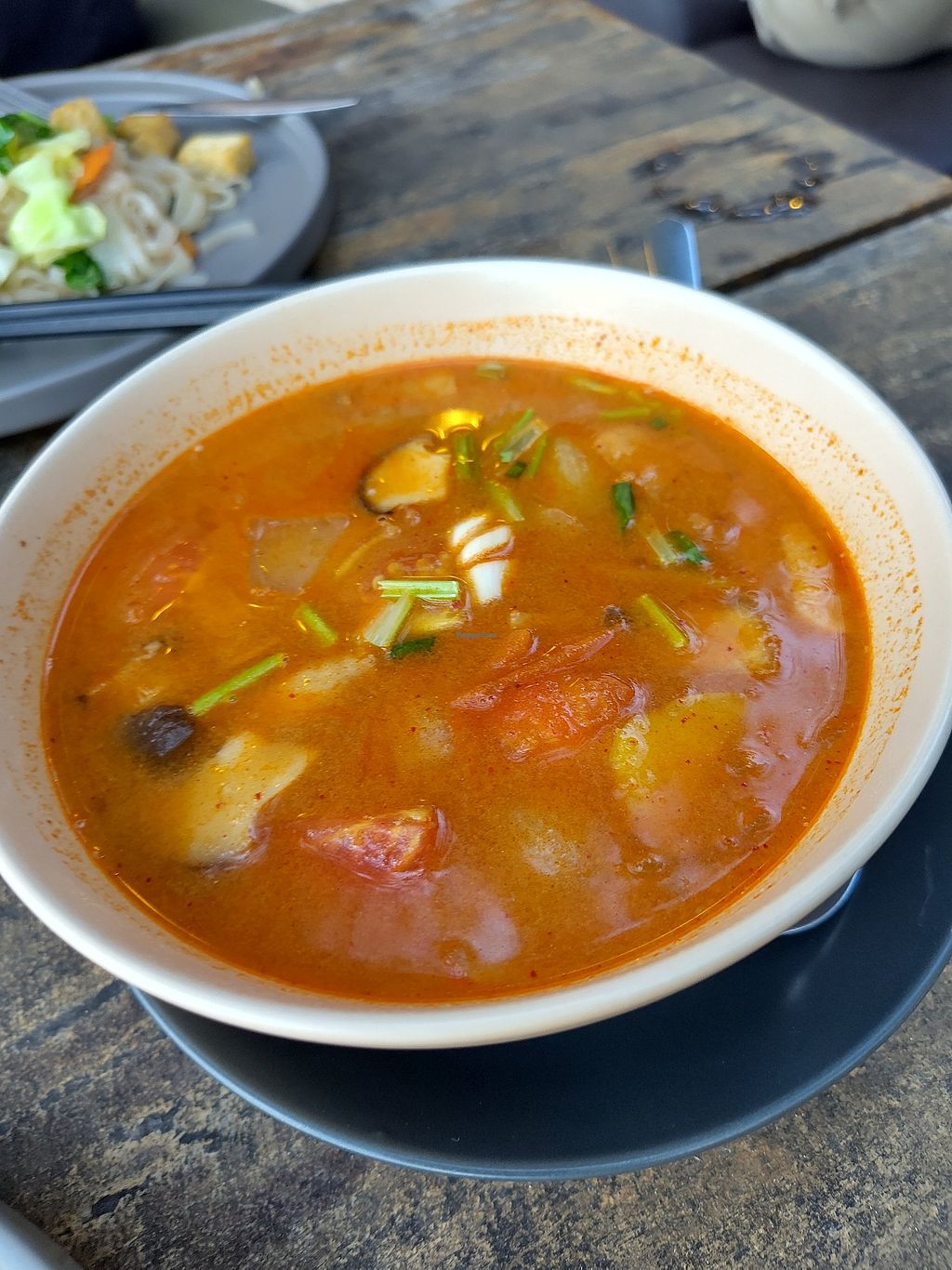 We enjoyed the great food and atmosphere. I had fried noodles with veggies and tofu, and a Tom Yum Soup. Both are indeed small portions so if you order two things together it is just right. The prices are very fair in my opinion. Also, if you want it vegan make sure to let them know „no eggs“.