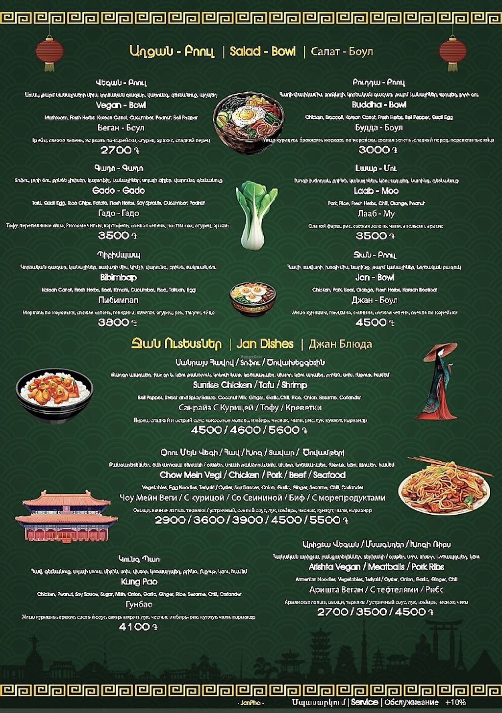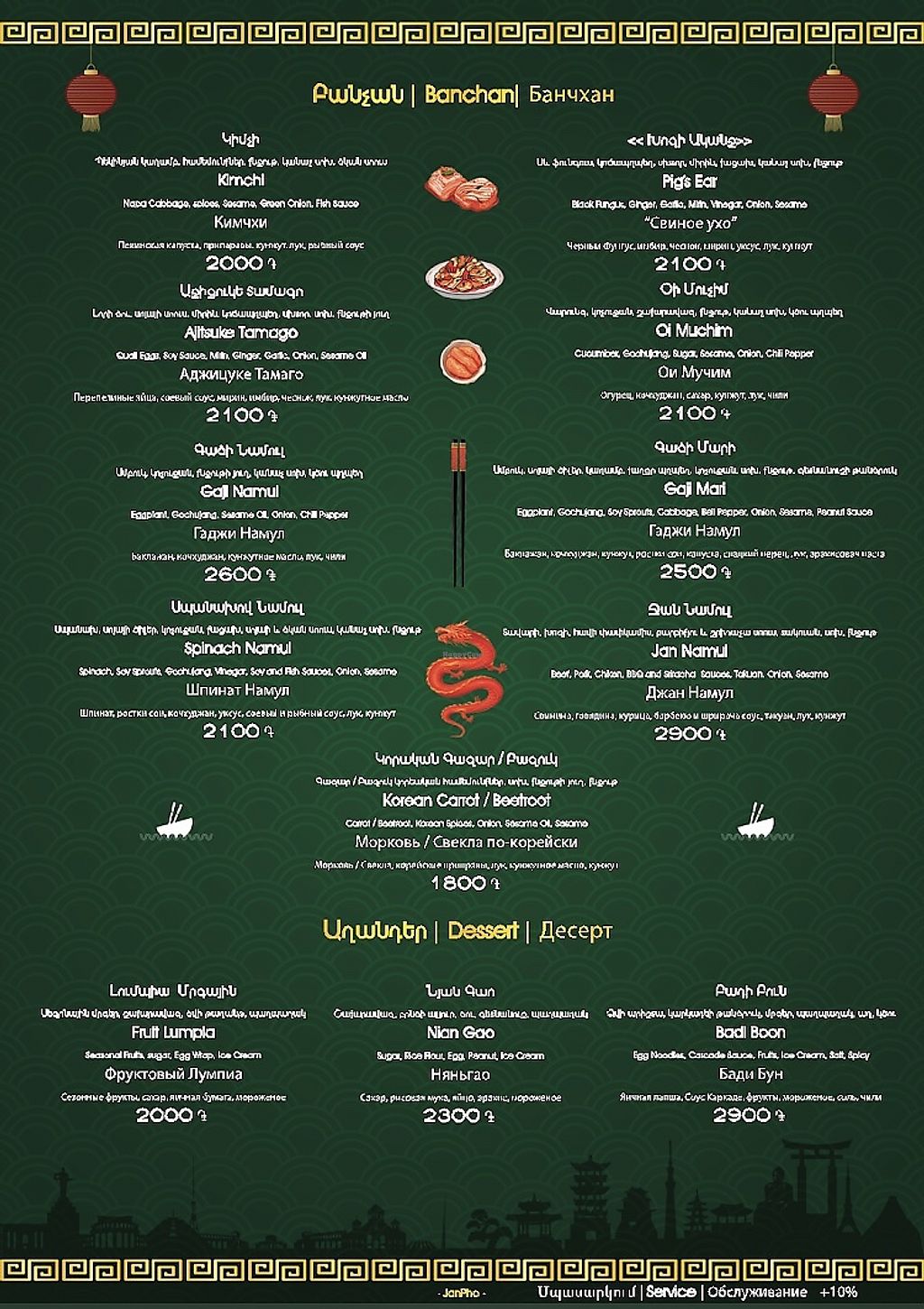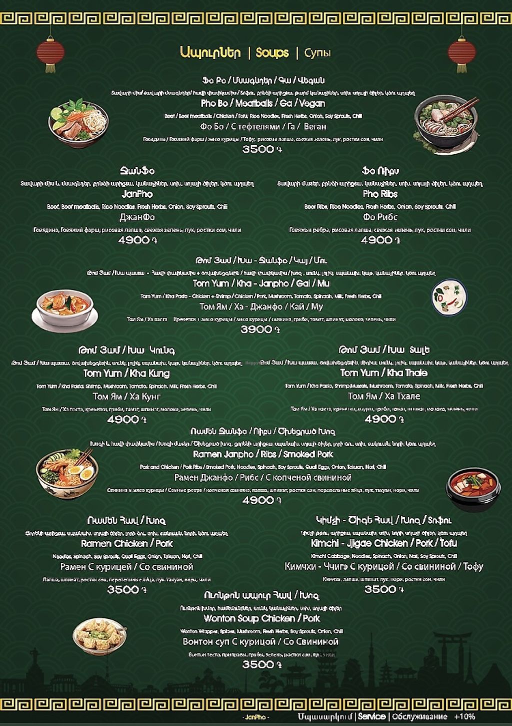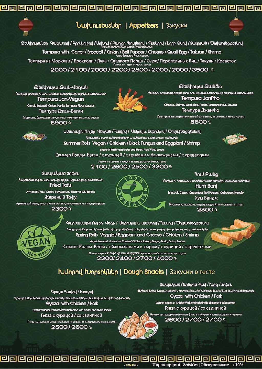 Lots of vegan options available and staff were incredibly kind and helpful (English speaking). I had the Vegan Pho, while not traditional Pho flavors it was a really nice remix on it and it really hit the spot in this cold Armenian March weather. The broth was listed as a purple cabbage broth. They even had a kimchi sauce (tasted kind of like a homemade Sriracha) and a spicy/ sour sauce that I really liked added to the Pho. At the end, the staff brought me a black tea with dark cherry (deep tea flavor with mild tart cherry)... YUM! I didn't even see it on the menu but that was just the icing on the cake. I randomly walked by this place and I'm so glad I did😄I even decided to get the tofu appetizer to take for later...tofu was listed as Armenian tofu (not sure what that means exactly, maybe made locally?). It was so good! They do sell it by the block in the display case as well (along with their sauces).