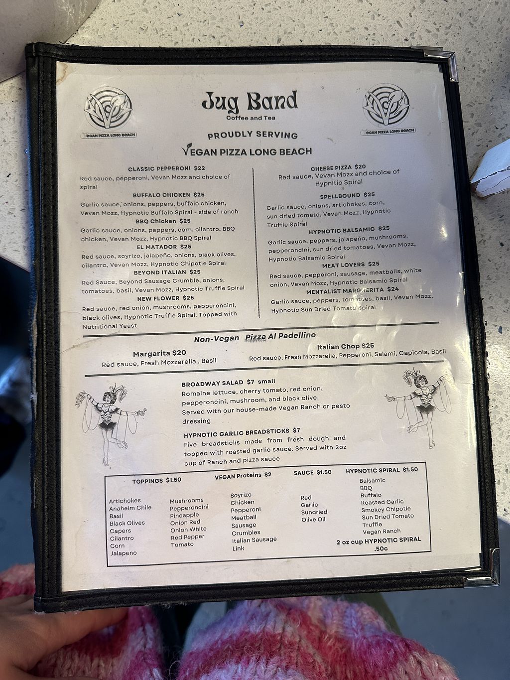 Serves meat, vegan options available. Mom and pop coffee shop that serves breakfast in the mornings and pizzas in the afternoons. Vegan choices include plant-based milks for drinks, vegan cheese for pizzas, vegan cream cheese for sourdough bagels and breakfast burritos with choice of Soyrizo or Beyond Sausage.
