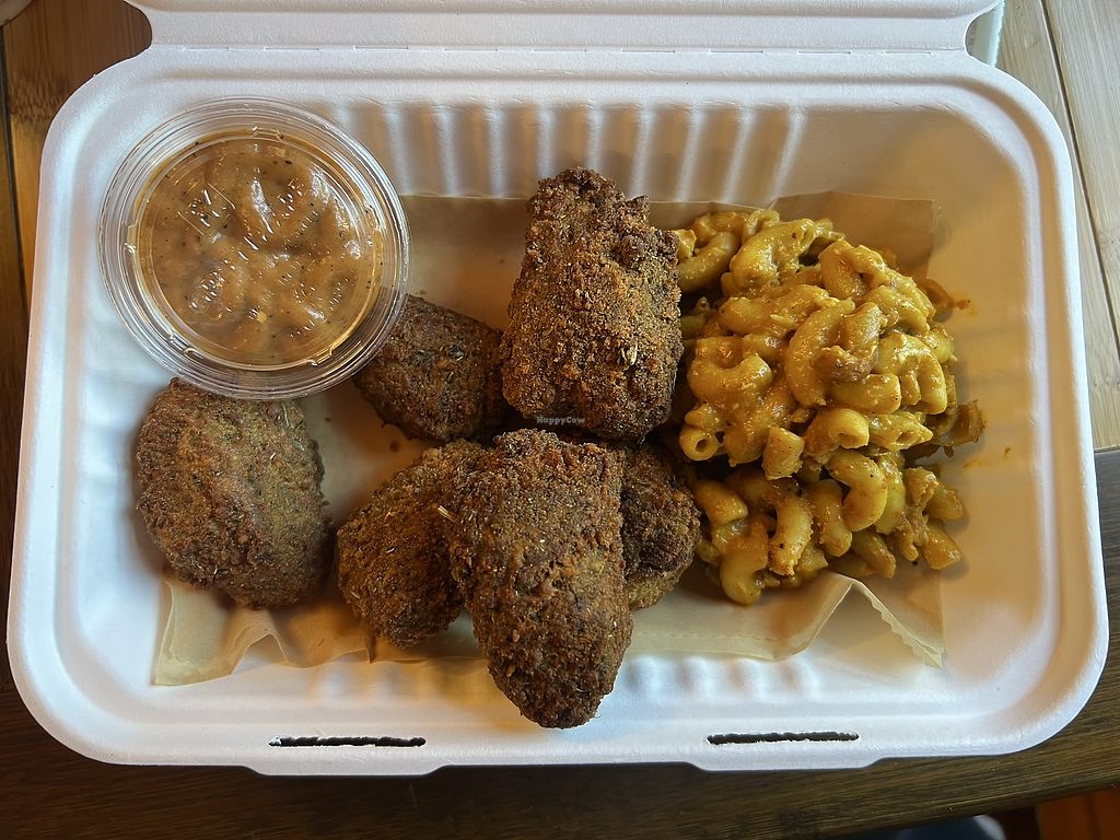 Lots of tasty vegan takes on classic comfort food. I had a delicious chix sandwich with a side of mac n cheese, which was absolutely delicious.