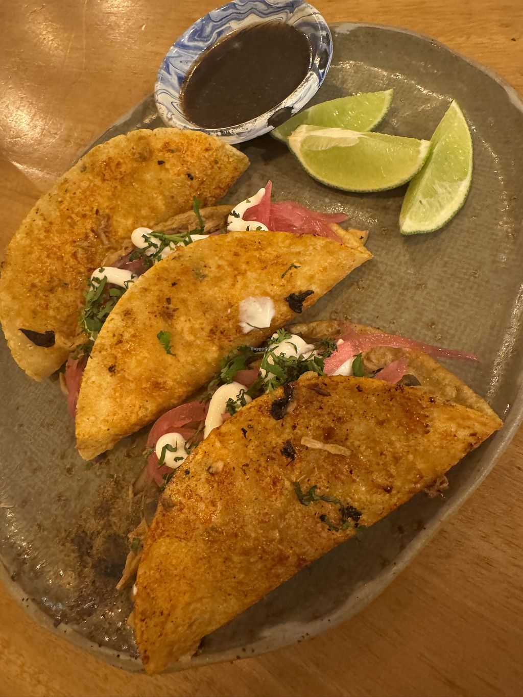 Excellent good with a mature flavor. Big menu with many options. Full vegan. The mushroom tacos and spiral fries were favorite. Incredible cocktails and an incredible chocolate cake. #Veganuary
