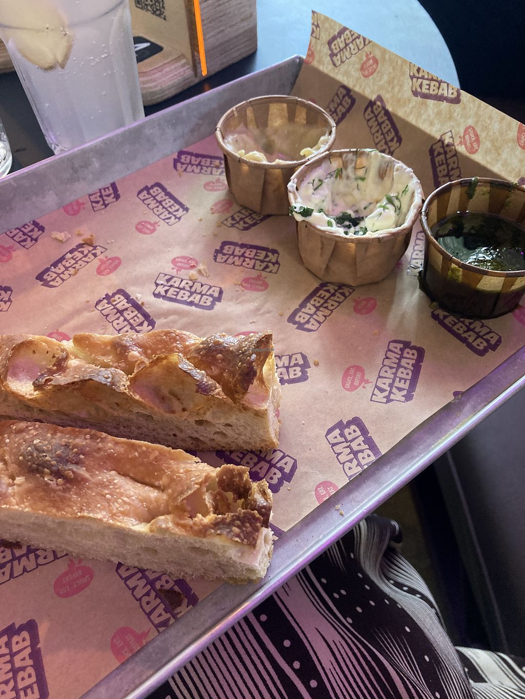 Alles is lekker bij Karma Kebab. Er is een fijne sfeer, zowel binnen als buiten. Wij hadden beide hoofdgerechten genomen en drie bijgerechten met drie personen. Was precies goed zo.