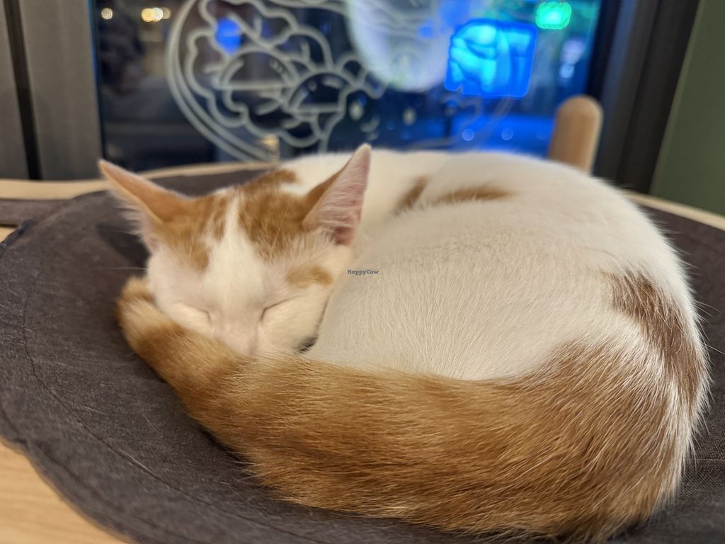 Super nice vegan cat cafe. Cats and vegan food, what more could you want! We had delicious food, everything is freshly prepared. The decor is very nice and beautifully cat-oriented. It looks very clean, new and fresh. Nice that the cats walk around freely and look for you when they feel like it, as befits a real cat. The menu also tells you all about the beautiful concept of this cafe.