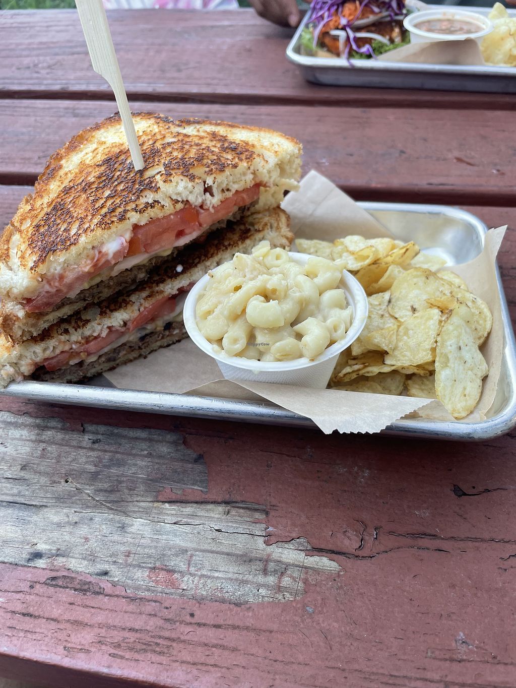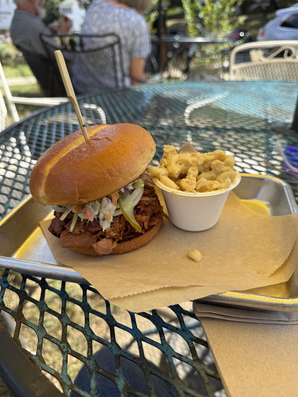 Bbq jackfruit sandwich with Mac and cheese. Comes with chips but I di…