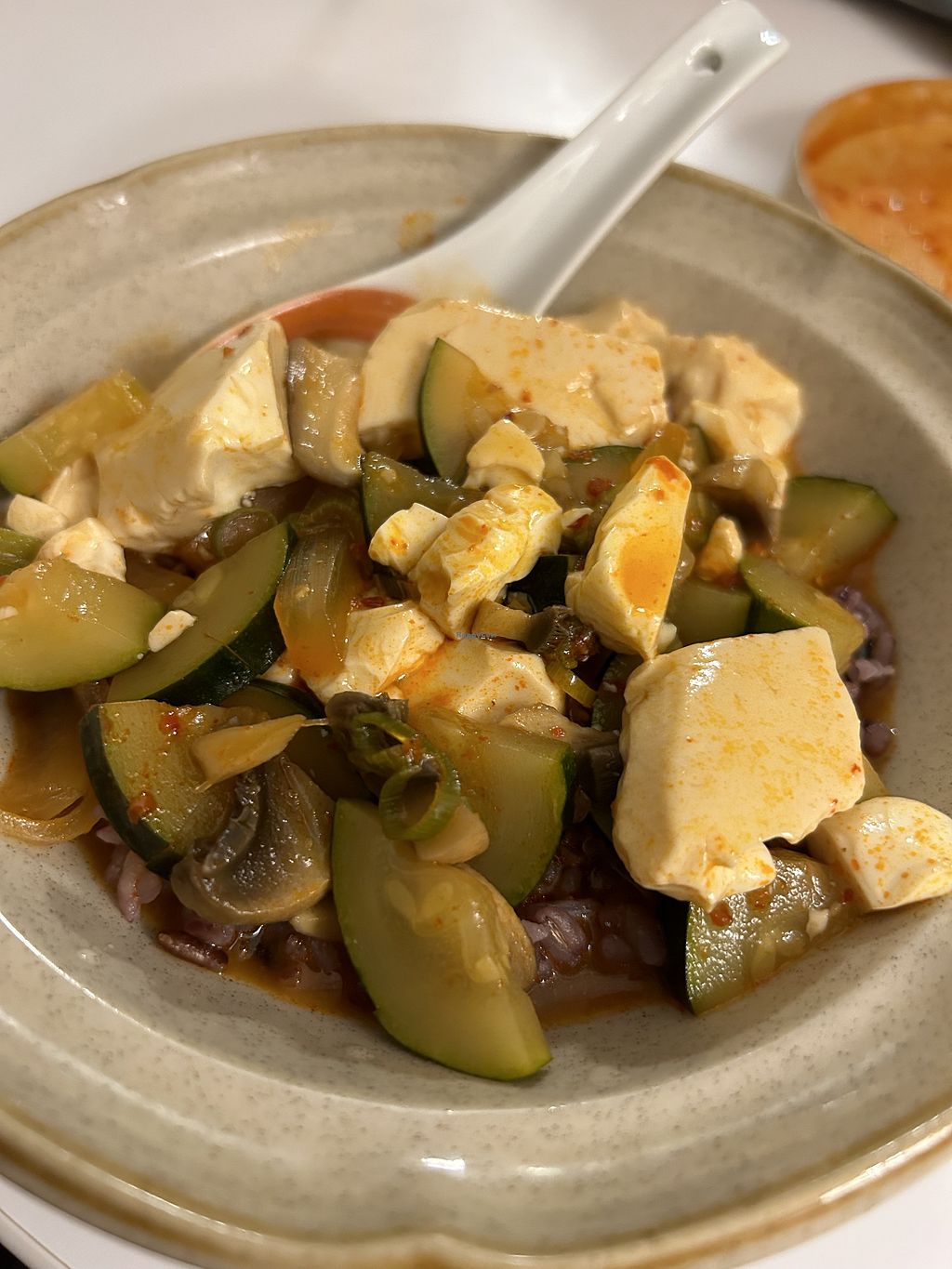 Serves meat, vegan options available. Korean restaurant providing vegan kimchi and other options including vegetable sushi, avocado rolls, tofu soups/stews, tofu rice dishes, and various traditional banchan side dishes like spicy bean sprouts, garlic cucumber noodles, soy braised tofu, and pickled king oyster mushrooms. Specify vegan when ordering. Open Mon-Sun 11:30am-10:00pm.