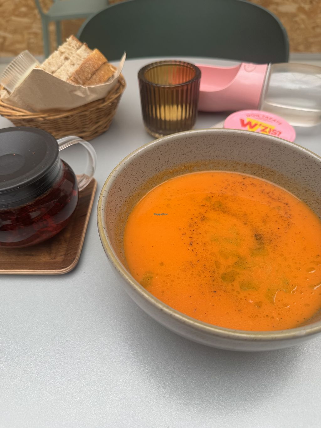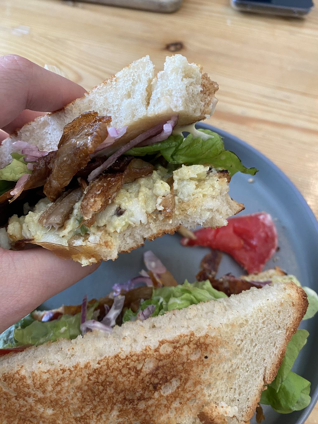 Couldn’t find much real food on the digital menu but lots of cakes and coffees. But maybe I missed it. Had soup of the day along with sourdough bread and homemade plant butter. Very nice. Ordered large soup - was tomato - and was a good size