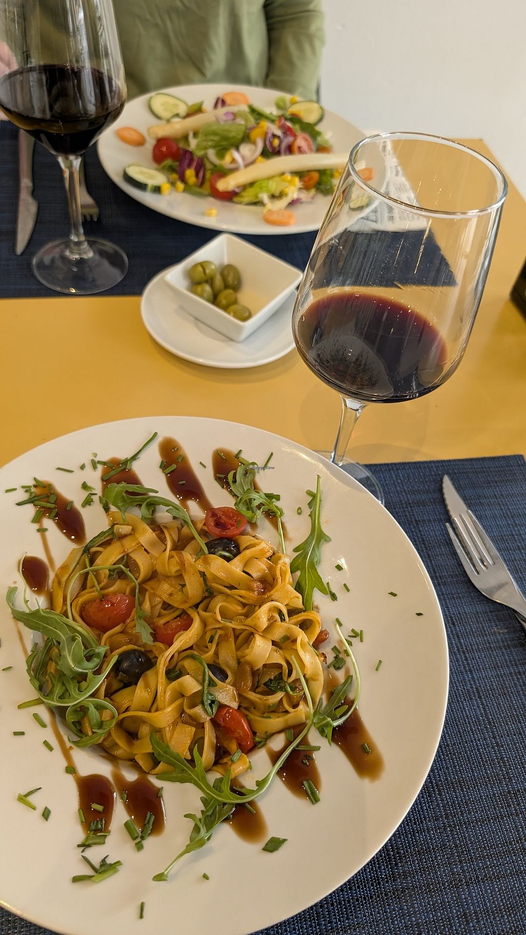 Came for lunch (Weekday, early March). Not busy at all. Got a vegan salad and the vegetable pasta. Waitress asked if ok that there is egg in the noodles. The salad was nice, and my pasta was delicious, but I feel that they were overpriced. Keep in mind that the bread on the table is €1.50 per person, and if you don't eat it, make sure it doesn't show up on the bill.