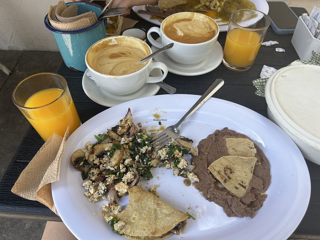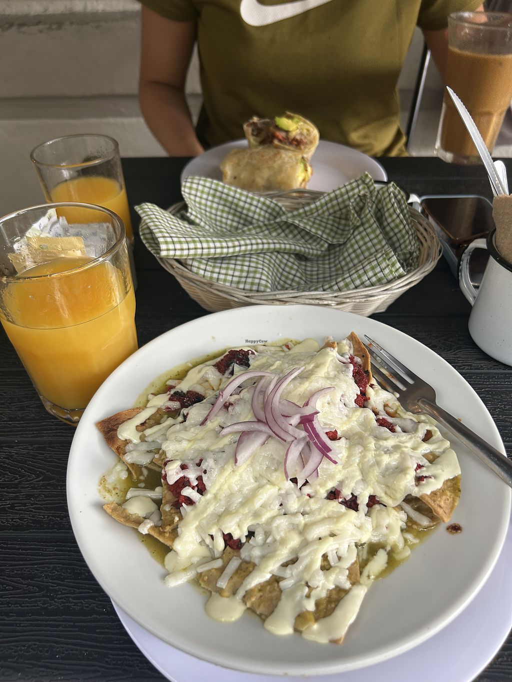 Fully vegan mole chilaquiles with tofu, bread as a base, vegan cheese …