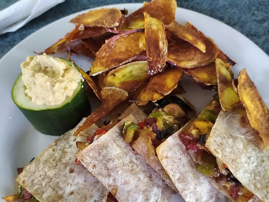 La Cozumelena has great Vegan options with high quality ingredients. I had a lovely whole wheat quesadilla full of Delicious vegetables and held together with yummy hummus. I couldn't detect any oil in the quesadilla. It was "The Bomb". Also served with fresh sweet potato chips and more hummus in a bowl made out of a cucumber. We also had a couple Wonderful superfood drinks made without dairy (one had almond milk) and sweetened with dates and stevia.The superfood drinks made up a large portion of the menu and included many different recipes, all extremely healthy. It was hard to choose. I am so happy we found this place. The service was exceptional and the place was packed with locals. I just wish we found this place sooner on our vacation. We will return next time.