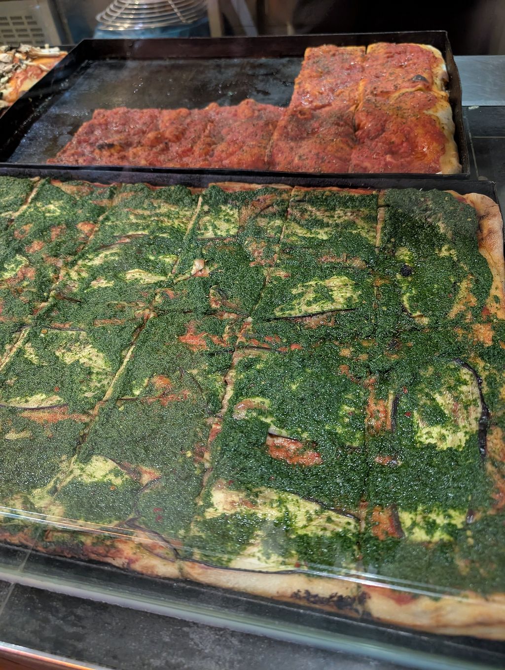 Serves meat, vegan options available. Foccacia shop that serves meat, vegan options available, Foccacia with either tomato sauce, potato and onion or tomato sauce and eggplant, all options clearly marked Open Mon-Sun 11:00-19:00.