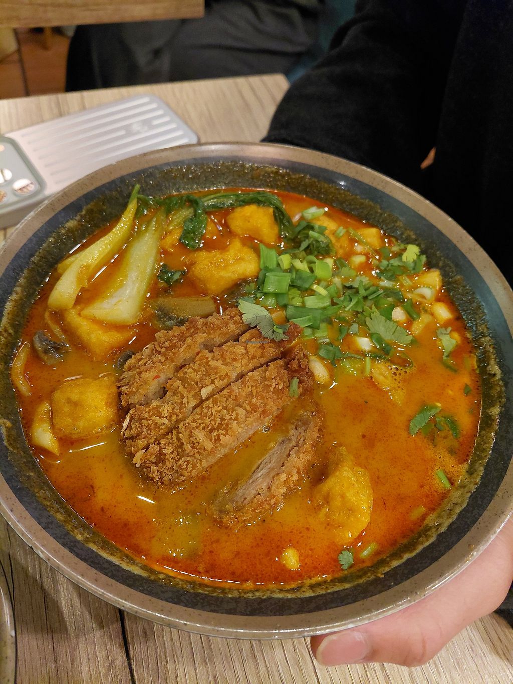The curry was warmed up lukewarm. The bowl very dry. The appetizer came last, but tasted good.