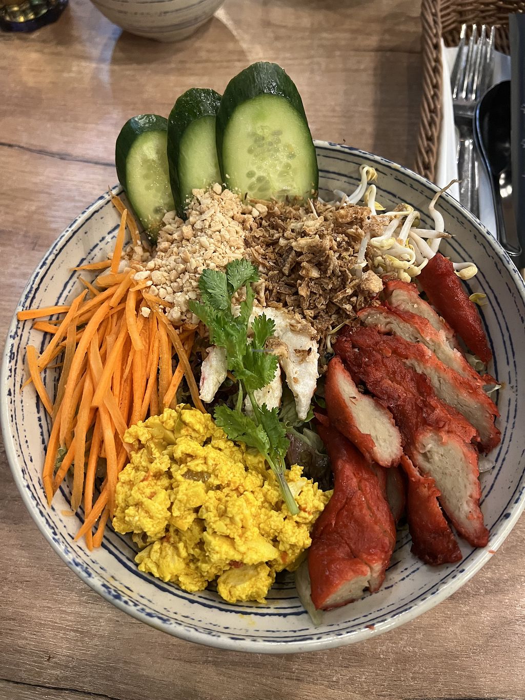 We tried two of their rice noodle bowls with mock meat and a lot of fresh veggies + vegetable tempura. Super delicious but the portions were huge - even though we both eat a lot, we didn't manage to finish everything (other people around us seemed to fight with the size of the dishes). So if you are really hungry, searching for somwthing east asian and this for a fair prize, try La Vegana :)