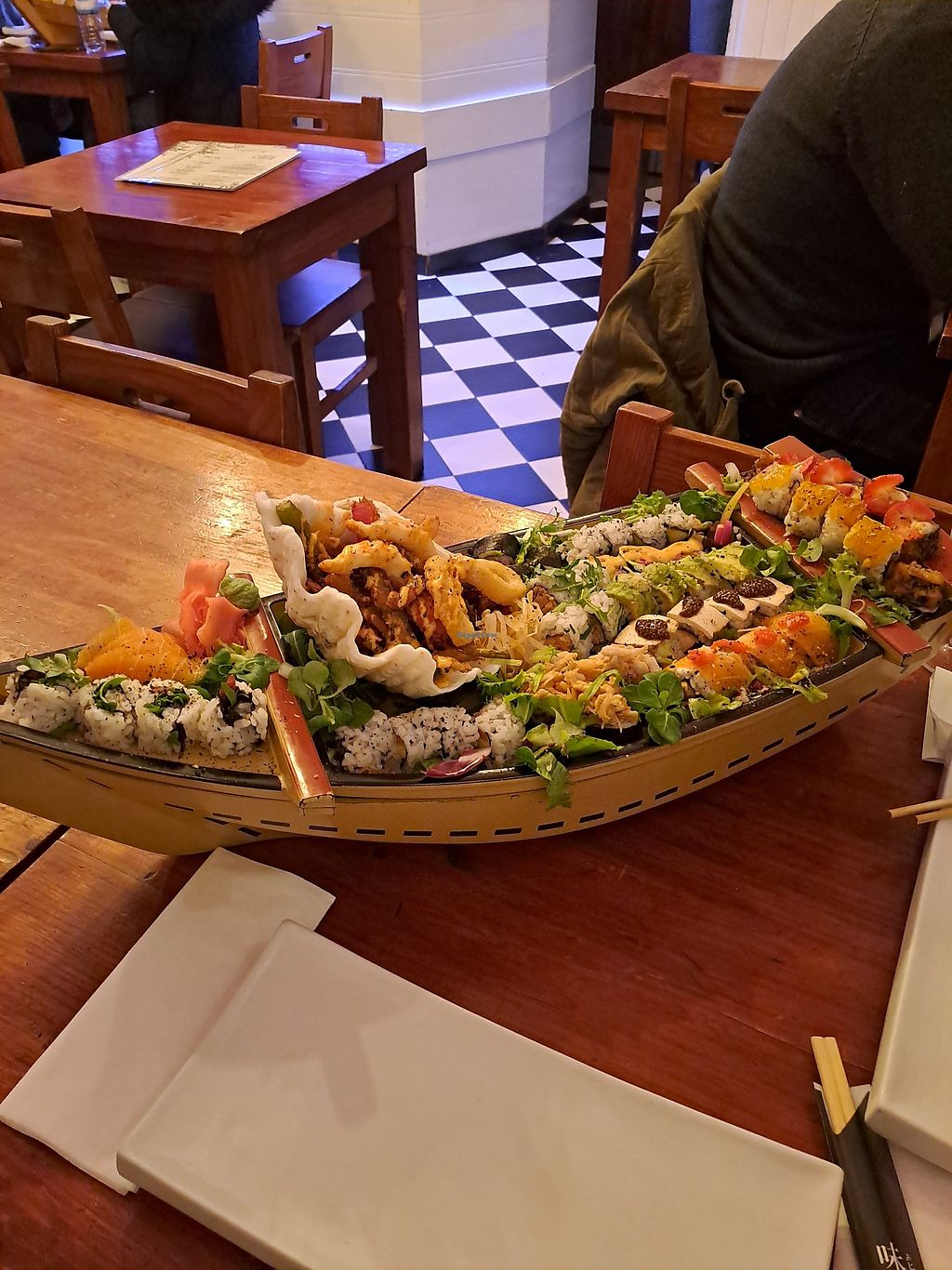 The sushi boat was very fun and something vegans usually don't get to experience. The sushi was also pretty good. However, they serve the sushi boat with half of a giant clam shell on it, and put the food on top. Such large in-tact shells are rarely found just washed up on a beach after the animal has died and are usually acquired by clam fishers killing an animal that has grown large over several years or decades, or grown in fisheries. However it was obtained, serving vegan food on an animal body part isn't in the spirit of vegan / anti-animal exploitation. I think if they need something to put under the tempura they should use a boat with a raised navigation area, or pile on more rice sheets or greens.
