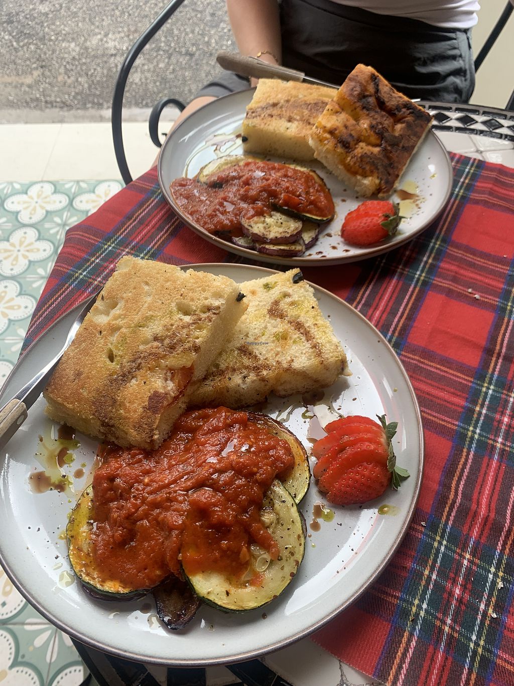 Die Besitzerin ist super nett! Es gibt nicht soviel auswahl, aber wir haben ein veganes Foccacia mit Aubergine bekommen, das war sehr lecker! Im Internet stehen von vor ein par Jahren auch andere Toast Optionen mit Avocado und Hummus, davon gibt es aber jetzt nichts mehr. (Daher war glaub ich dies die einzige Option)