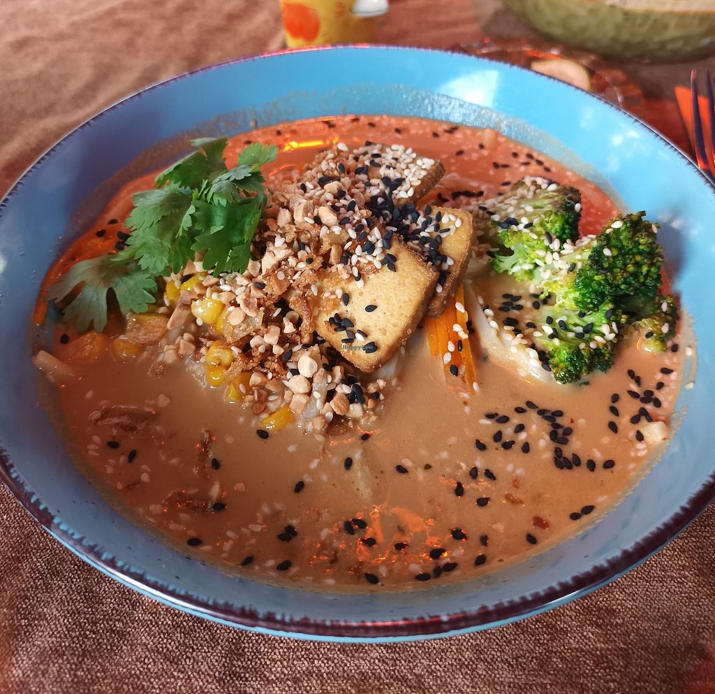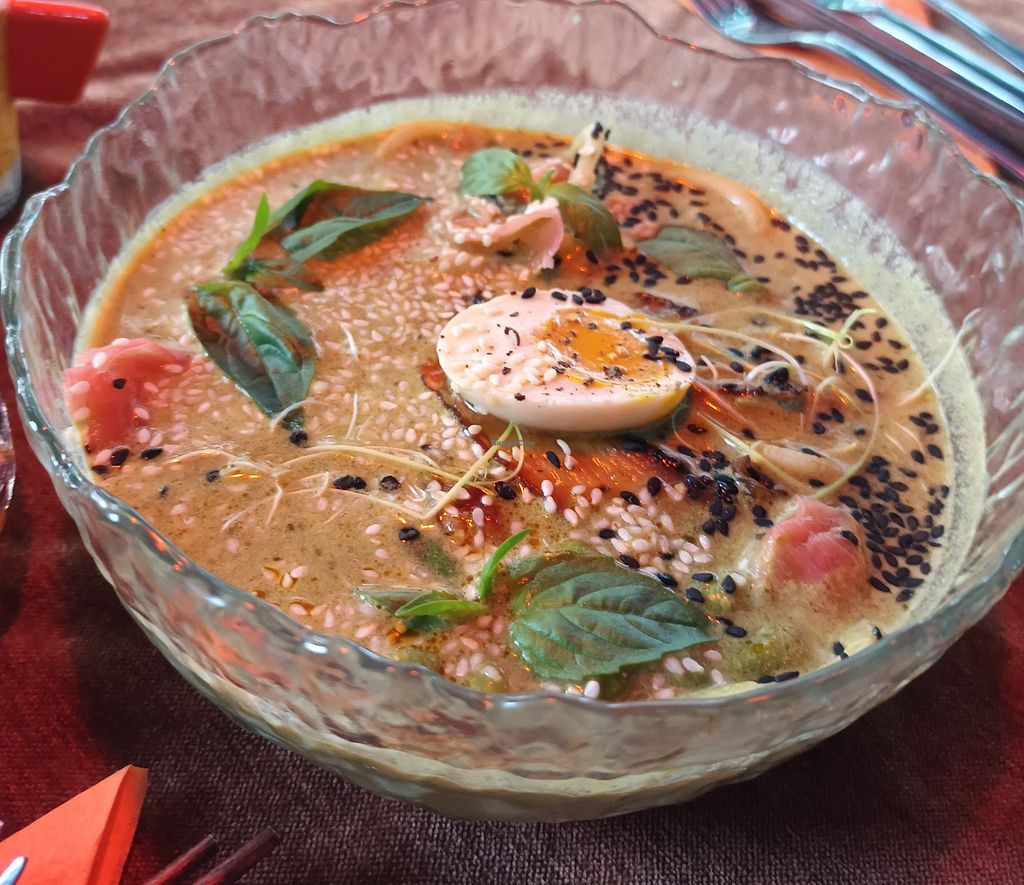 I love this place! The ramen is absolutely delicious—flavorful, comforting, and just right for my taste. I also tried the Asian salad with crispy portobello, which had the perfect balance of freshness and crunch. But beyond the food, the atmosphere really makes this place stand out—funky, vibrant, and full of character. And the best part? There’s this adorable dog hanging around who even started doing push-ups for my photo! Can't wait to enjoy some amazing food and see this sporty pup again!