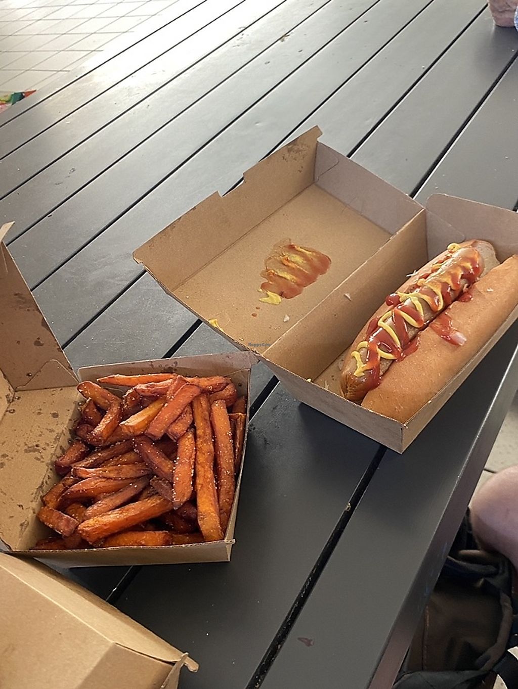 Stopped here to grab food to pack for tennis. All very tasty. Breakfast foods served all day. I got the Chick'n Waffle. I'd get an extra side of syrup as the chick'n sucked up all the syrup and the sandwich was on the dry side. I also had the Classic hot dog and sweet potato fries. There are a number of sauces available. I don't know which one I got, but it was very garlicky. The quintessential fast food joint. No where to sit, just grab it and go.