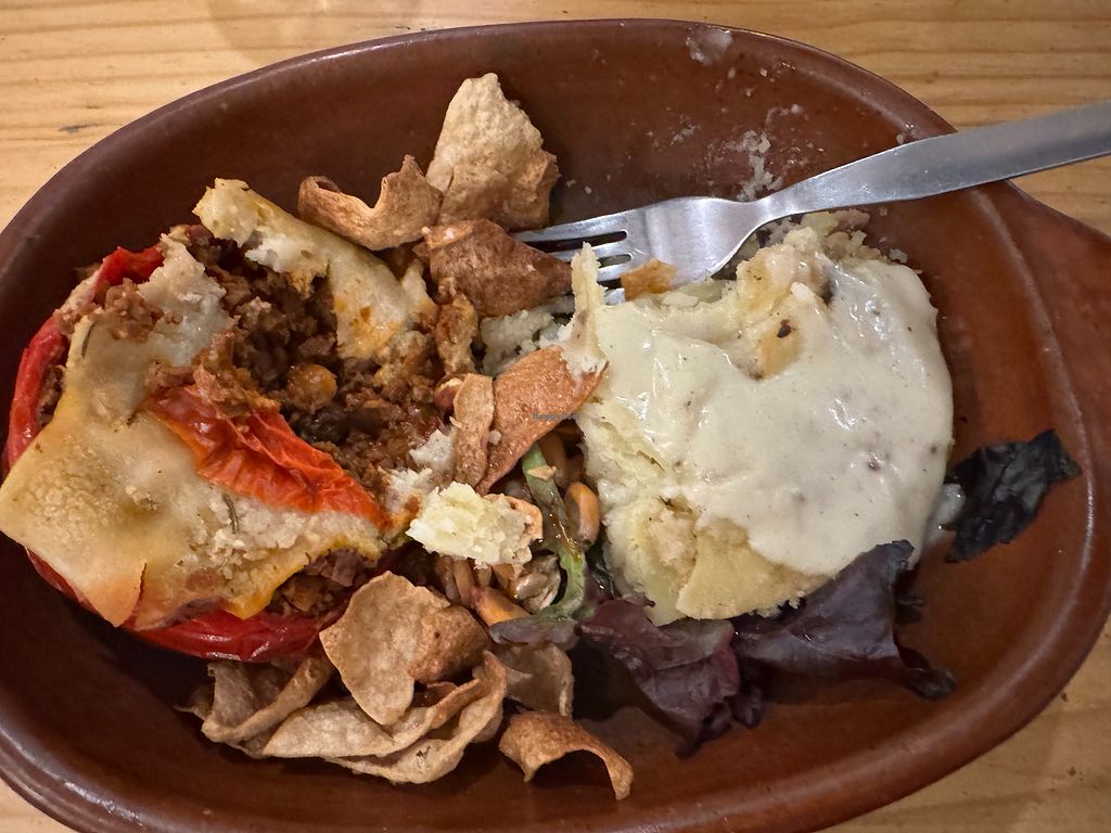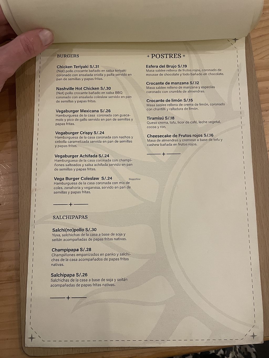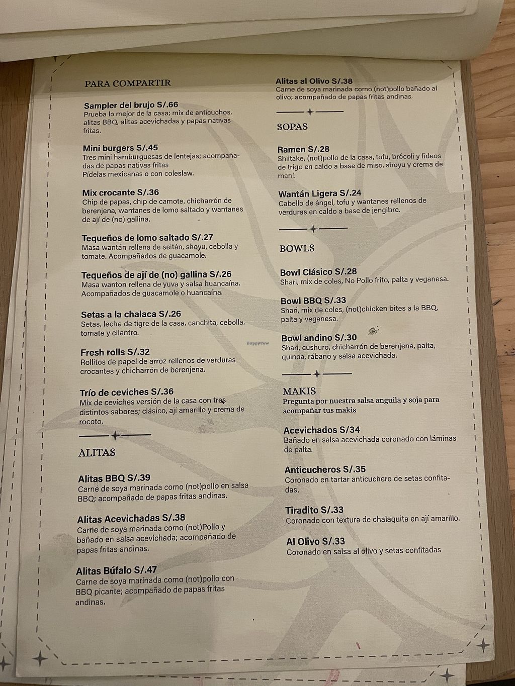 We had the ceviche de setas y champioñes, the rocoto relleno and the vegan Nashville chicken. The ceviche was amazing; so many different flavors and textures! The rocoto relleno was delicious too and so nice to be able to try a local delicacy that’s normally not vegan. We were not overly impressed by the Nashville chicken, but we would 100% recommend to try the ceviche and rocoto relleno!