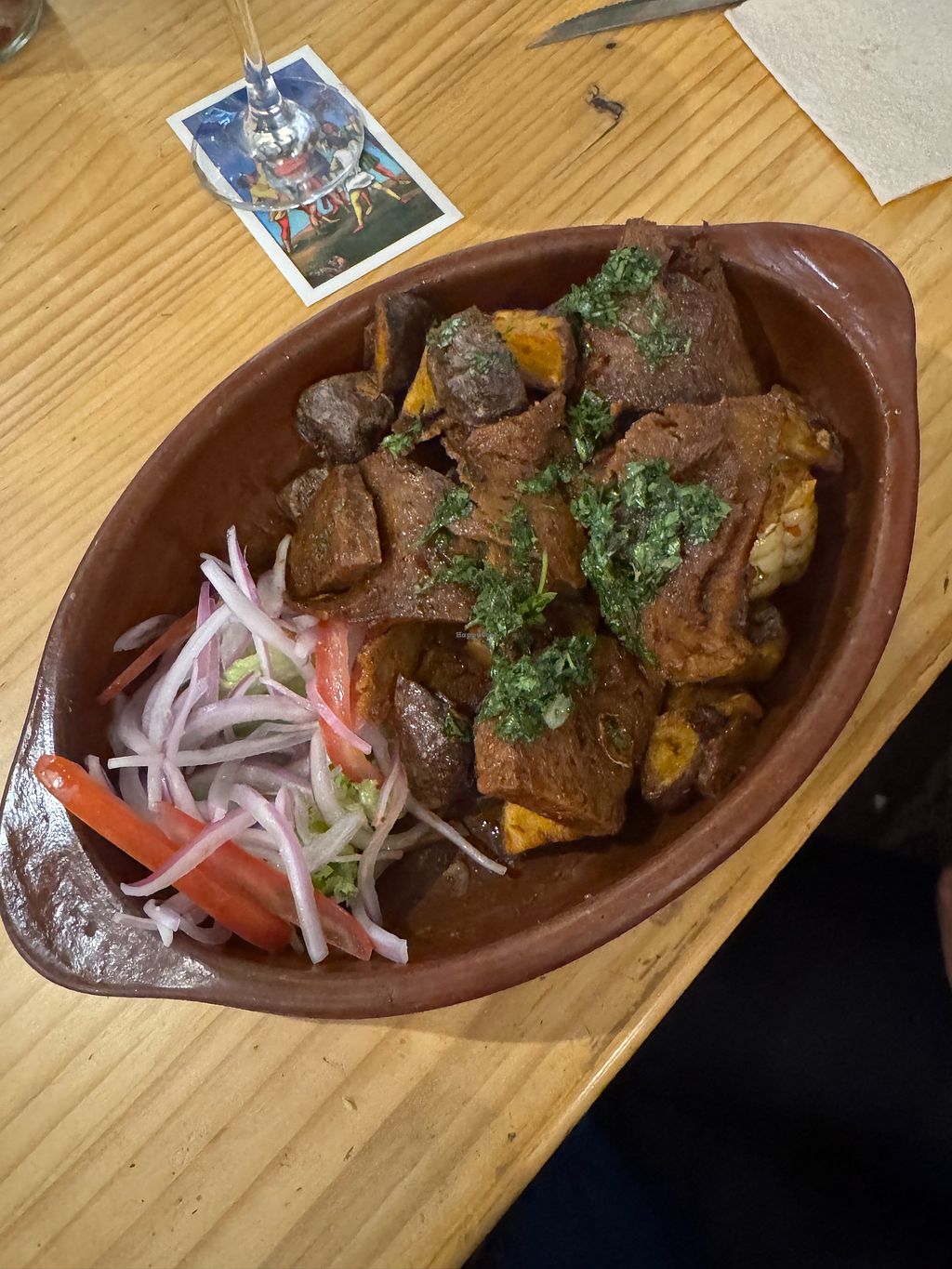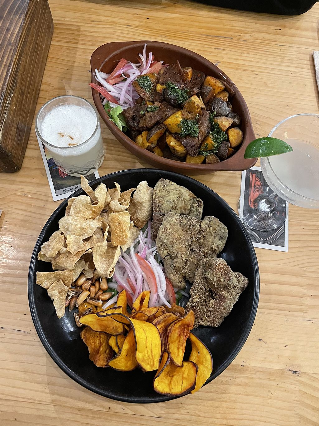Lovely venue with an interesting, mostly Peruvian menu. Chose the lomo saltado and the chicharron. Good sized dishes, both quite rich and VERY salty. Both also had a lot of garlic. We liked them both but would have benefited from more fresh ingredients to cut through the richness. Glad to see vegan pisco sour on the menu too.