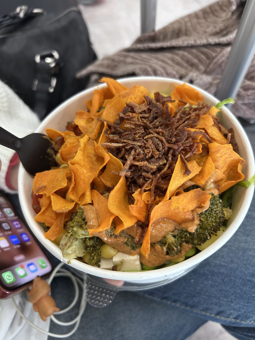 Poke bowls assembly line type of restaurant inside queretaro airport gate b. seems to be the only restaurant in this terminal. sells meat and fish and diary. protein option is tofu. bases are vegan. white rice. brown rice. almost all sauces and other toppings are vegan