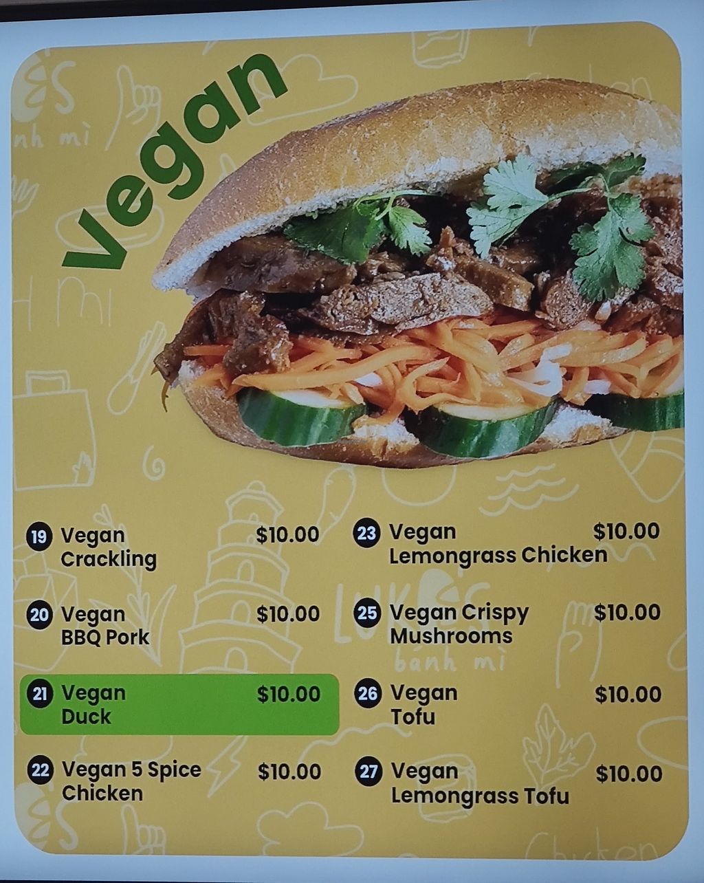 Serves meat, vegan options available. Sandwich shop offering clearly labeled vegan and veganizable dishes like vegan bánh mì (Vietnamese baguette sandwich) with fillings like "Vegan Crackling," "Vegan BBQ Pork," "Vegan Duck," and "Vegan Crispy Mushrooms," as well as options like "Vegan Tofu" and "Vegan Lemongrass Tofu." Open Mon-Fri 8:00am-4:00pm, Sat-Sun 9:00am-4:00pm.