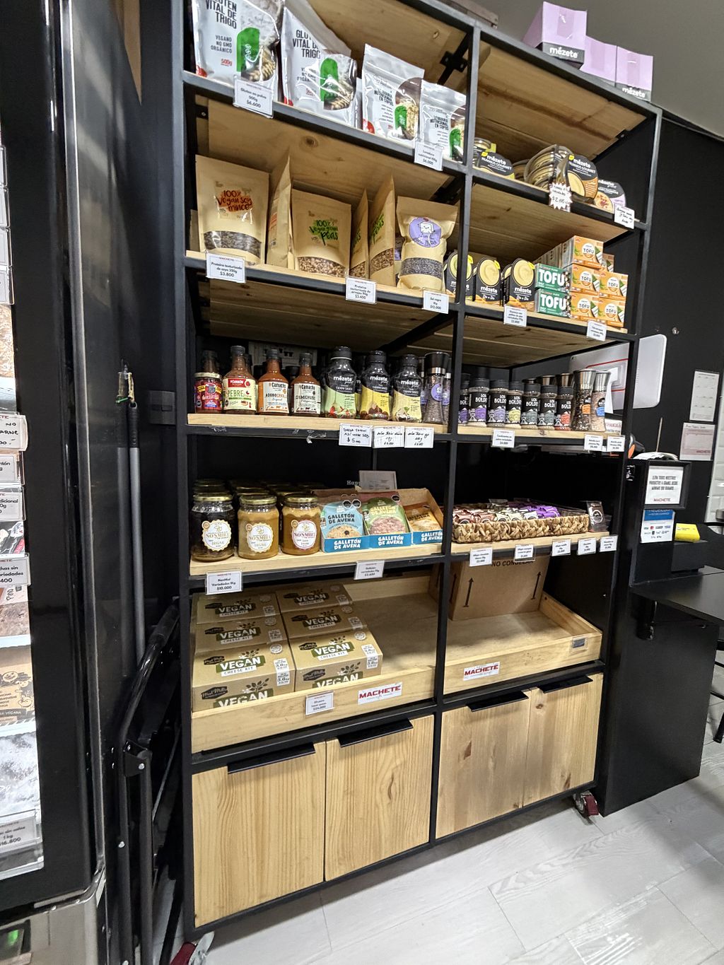 Cute place! There are fresh seitan and soy products like salami and roast beef but also a wide selection of frozen seitan products, sausages etc. Also sells cheese made from nuts.