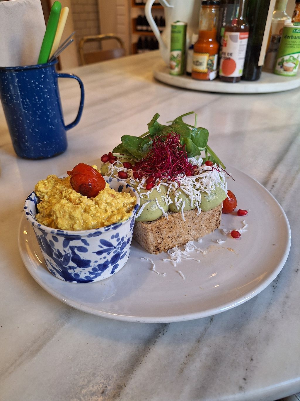 Avocadotoast (Achtung mit Koriander) , Spinat , veganer Käse und Scram…