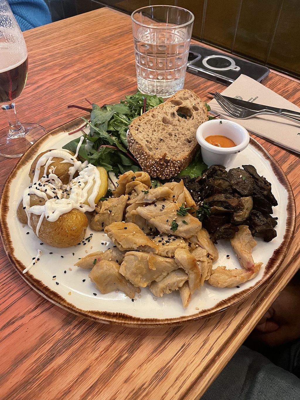 Cependant le service a été long et les plats n'étaient pas très copieux. Le principe est de choisir 1 protéines et 2 accompagnements. La quantité de chaque élément laisse à désirer. La moitié de l'assiette est remplie par de la salade et une tranche de pain.