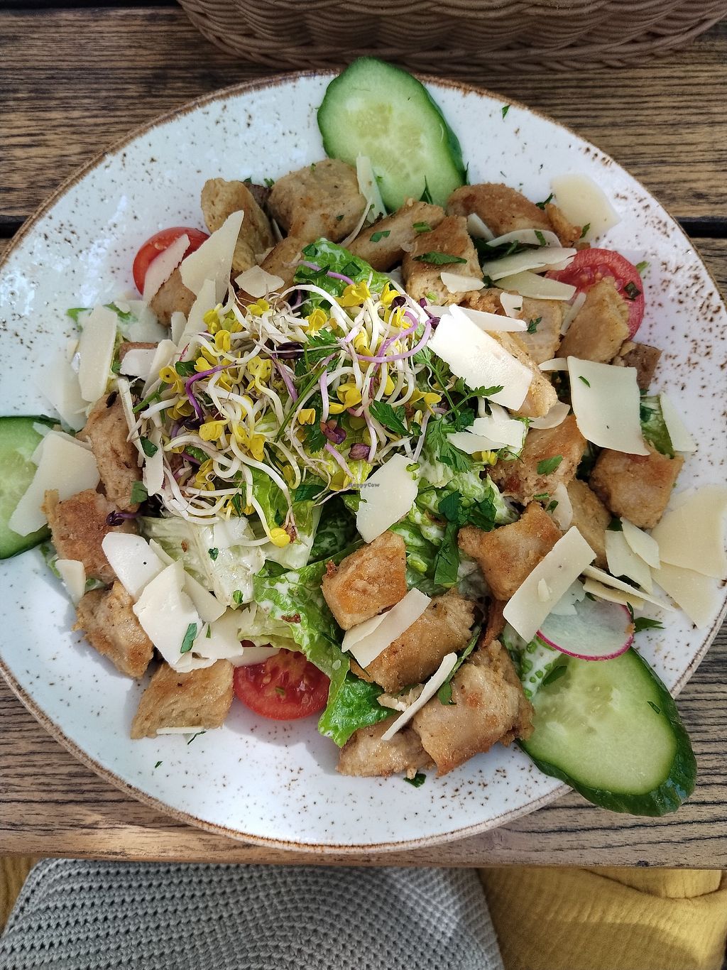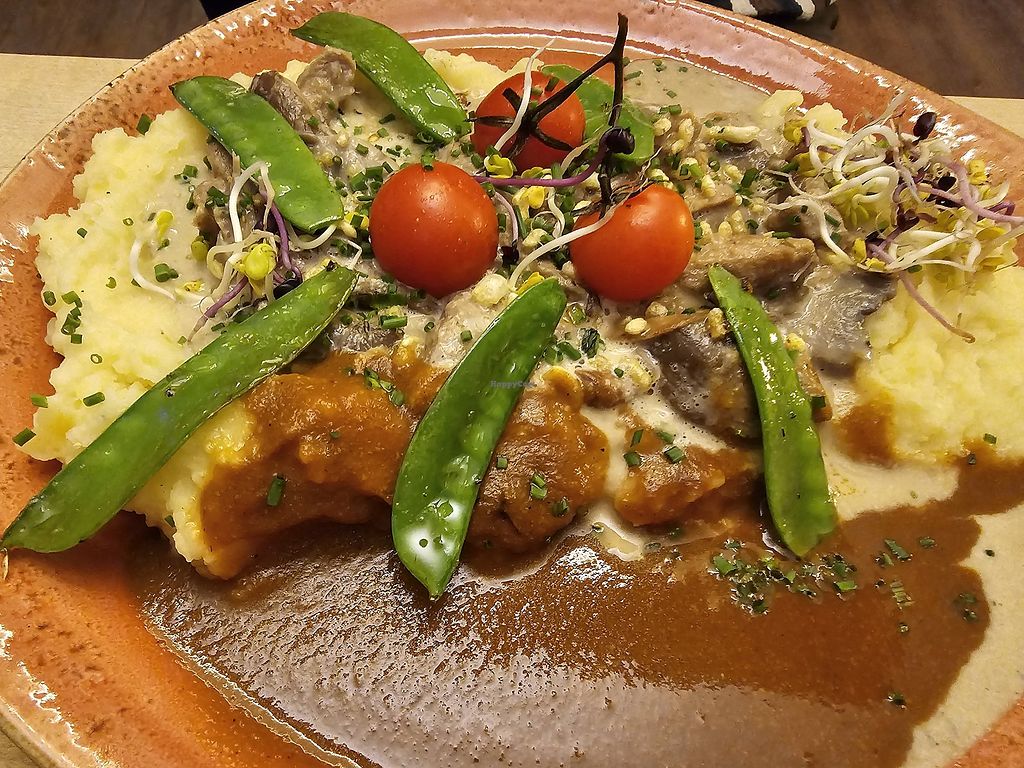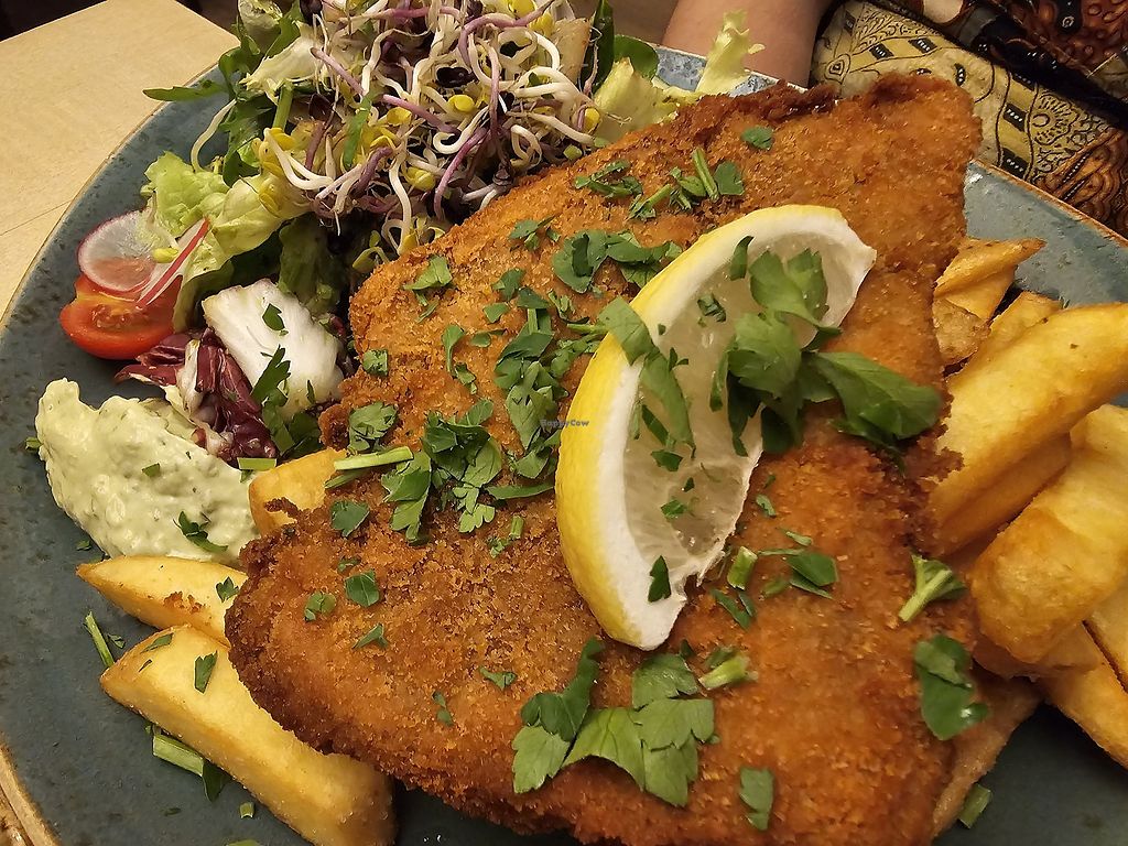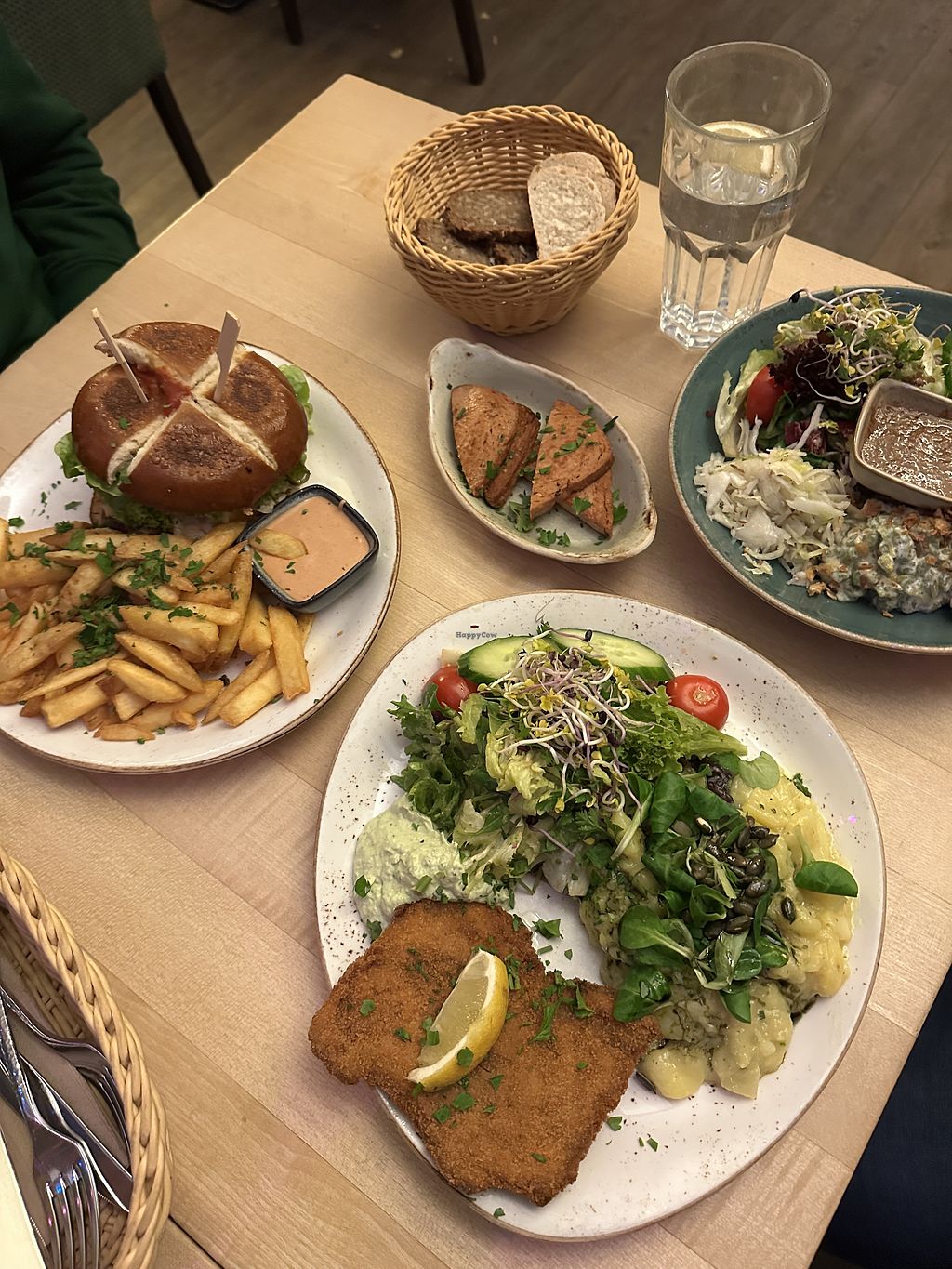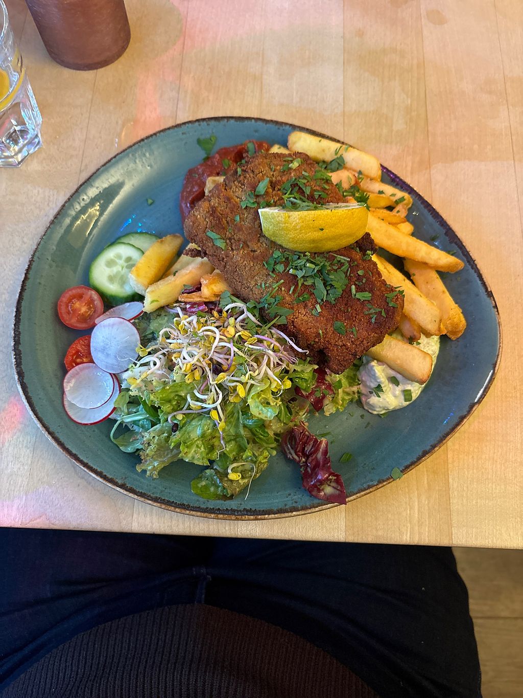 Bella esperienza: abbiamo provato i sapori germanici con ingredienti tutti vegetali. Abbiamo preso la Schnitzel accompagnata da patatone fritte, insalata di patate, un ottimo ketchup homemade al gusto di cumino, insalata di lattuga, germogli e rucola e una remoulade.