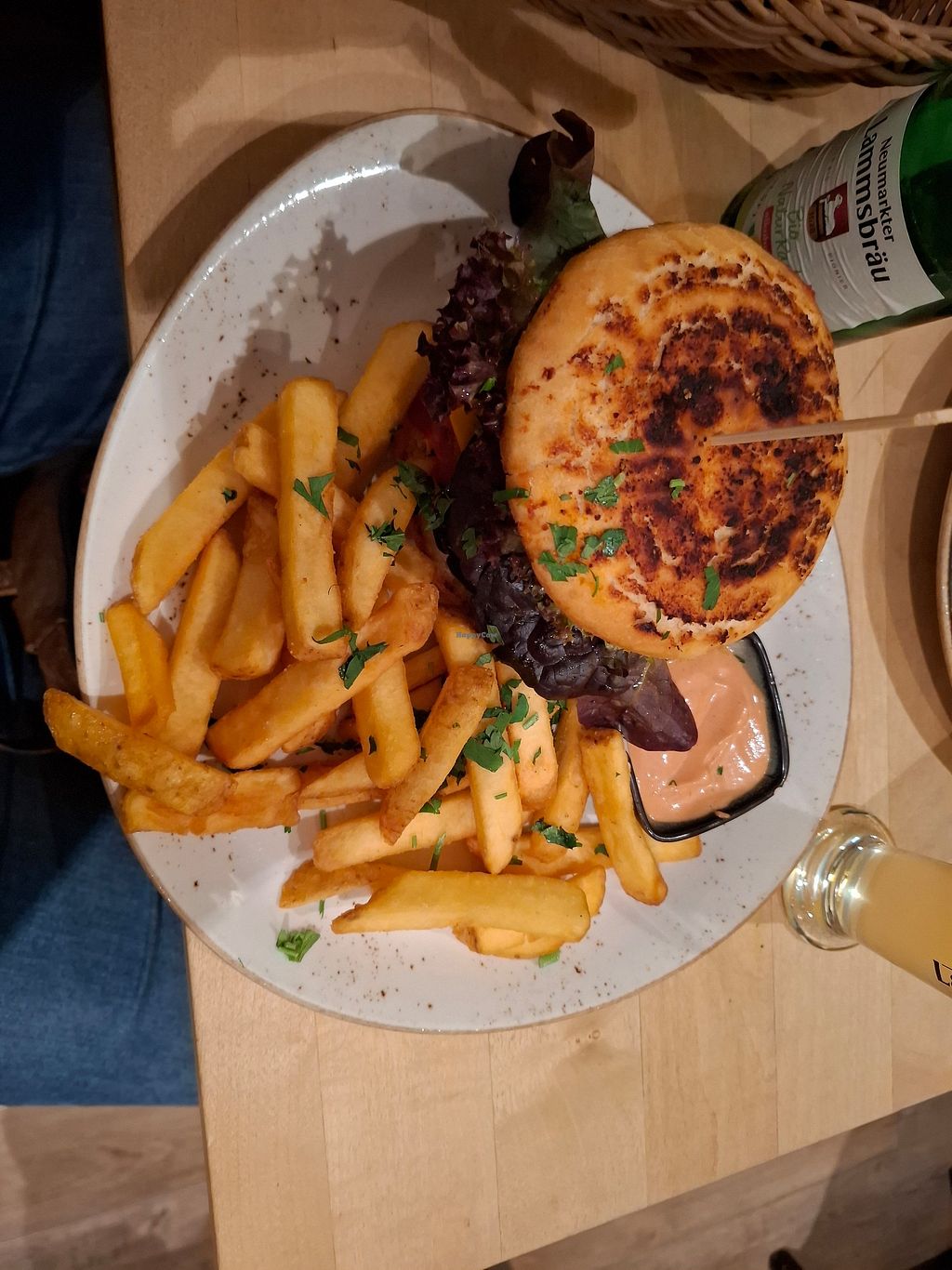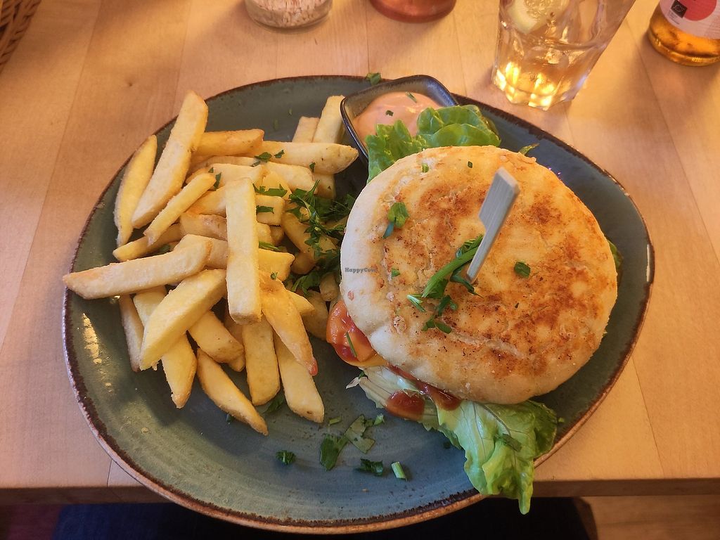 We had beyond burger and chips. The burger was loaded with lots of toppings and my wife took the option of a gluten free roll. The chips were like chips shop chips in the UK.
