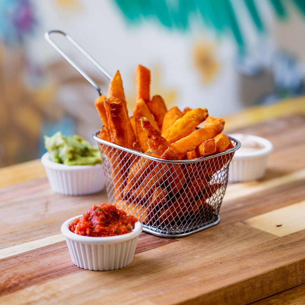 Serves meat, vegan options available. Vegan dishes are marked up in the menu. Example dishes include a Thai red veggie burrito, veggie chilli bowl, fajita, guacamole, various salsas and more. Has another branch in Bournemouth. Open Mon-Sat 12:00-22:30, Sun 12:00-21:00.