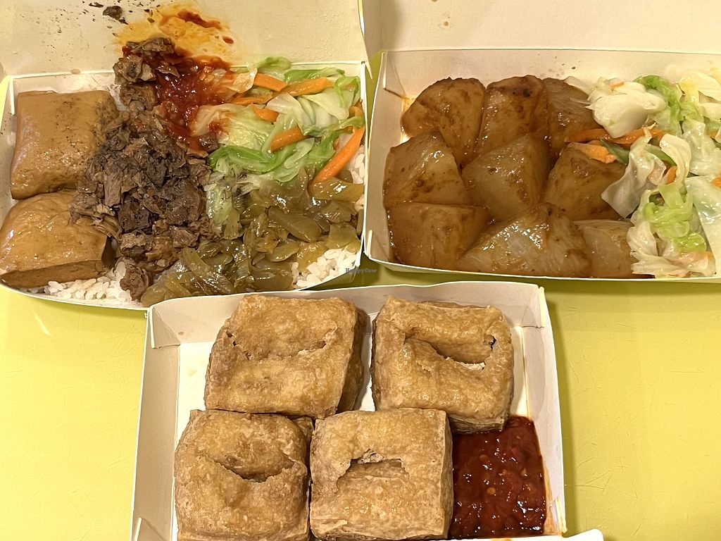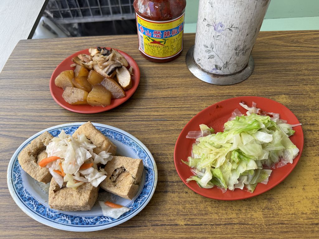 麵飯素食 , at 東區大同路7-2號, is a typical, basic veggie street kitchen. Serves stinky tofu, rice and noodle meals, as well as small plates with vegetables. The seats are outside but with a roof. No English. Open Mon 8:00am-9:00pm, Wed-Sun 8:00am-9:00pm.